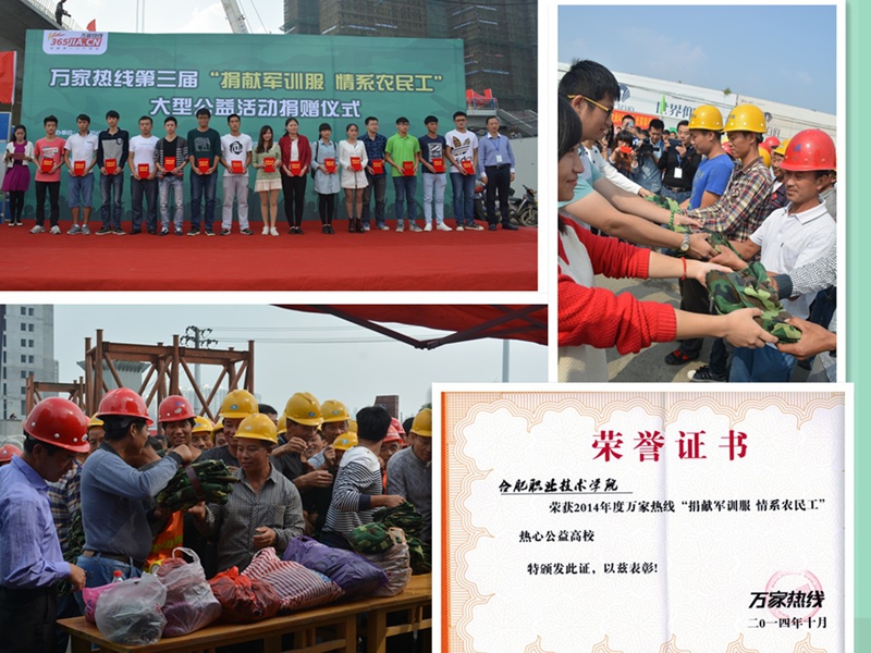 一年一度的军训过后,军训服对于大一新生就成了“鸡肋”,怎么有意义地处理军训服就成了学生头疼的问题。今年,我院青年志愿者协会主动联系万家热线,参加“捐赠军训服,情系农民工”大型公益活动。他们在学校广泛动员新生,把不用的军训服捐赠给为城市建设做出巨大贡献的农民工兄弟。