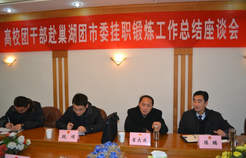 为了解我院挂职团干部工作情况,2012年1月6日上午,院党委副书记胡其云率队参加了巢湖团市委举行的“高校团干部赴巢湖团市委挂职锻炼工作总结座谈会”。巢湖市委组织部副部长翟大成、学院组织部部长叶树荣、医学分院院长周晓隆、医学分院党总支书记高恒平、院团委副书记佘海月及巢湖团市委相关领导参加了会议,会议由巢湖团市委副书记陈鹏主持。