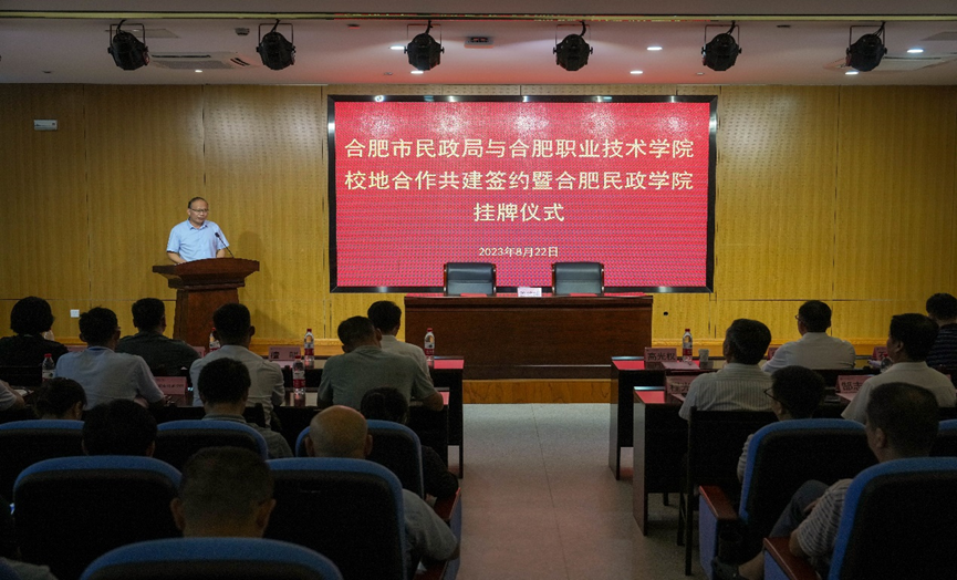 8月22日下午,我校与合肥市民政局校地合作共建签约暨“合肥民政学院”挂牌仪式在汇心湖校区举行。省民政厅党组成员、副厅长高光权,我校党委书记王杰才,校党委副书记、校长檀明,市民政局党组书记、局长徐生彬出席仪式并致辞。省民政厅、市民政局、市教育局相关领导,市民政局机关各处室、局属单位负责人、各县(市)区民政局、开发区民政机构负责人;我校党委副书记金飞燕,校党委委员、副校长周晓隆,相关职能部门、二级学院及专业负责人,部分专业教师共60余人参加活动。签约、挂牌仪式由檀明主持。