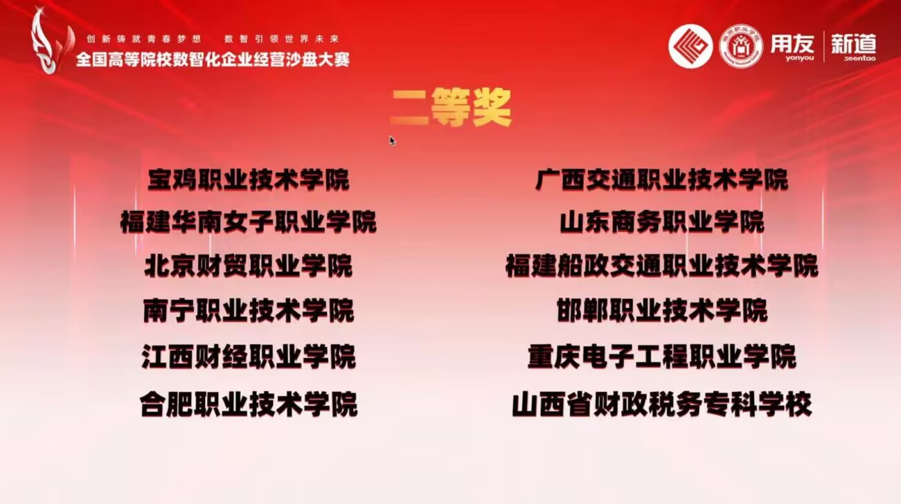 11月5日,全国高等院校数智化企业经营沙盘大赛(高职组)总决赛在线上举行,来自全国各地的116支代表队同台竞技。比赛过程中,我校经贸旅游学院选派的刘思豪、朱镕铭、贾欣雅、郭方周团队齐心协力,沉着应对复杂的市场营销环境,凭借稳定出色的发挥,总排名位列第18位,取得全国二等奖的好成绩。