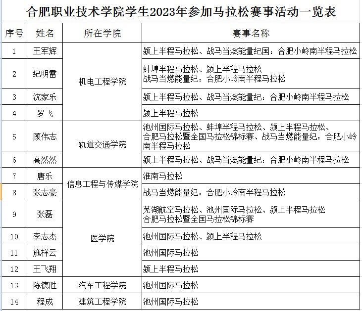 为贯彻落实党的二十大精神,“促进群众体育和竞技体育全面发展,加快建设体育强国”, 基础教育学院会同有关部门、二级学院积极组织全校学生参加校园健身跑,带动了一批同学成为跑步的爱好者。从芜湖航空马拉松、池州国际马拉松、淮南马拉松、蚌埠半程马拉松、颍上半程马拉松、合肥马拉松暨全国马拉松锦标赛,一直到12月9日的“2023战马当燃能量纪:合肥小岭南半程马拉松”,我校机电工程学院王军辉、纪明雷、沈家乐、罗飞,轨道交通学院顾伟志、高然然,信息工程与传媒学院唐乐、张志豪,医学院张磊、李志杰、施祥云、王飞翔,汽车工程学院陈德胜,建筑工程学院程成等同学一直在奔跑的路上,不断追求自我、超越自我。
