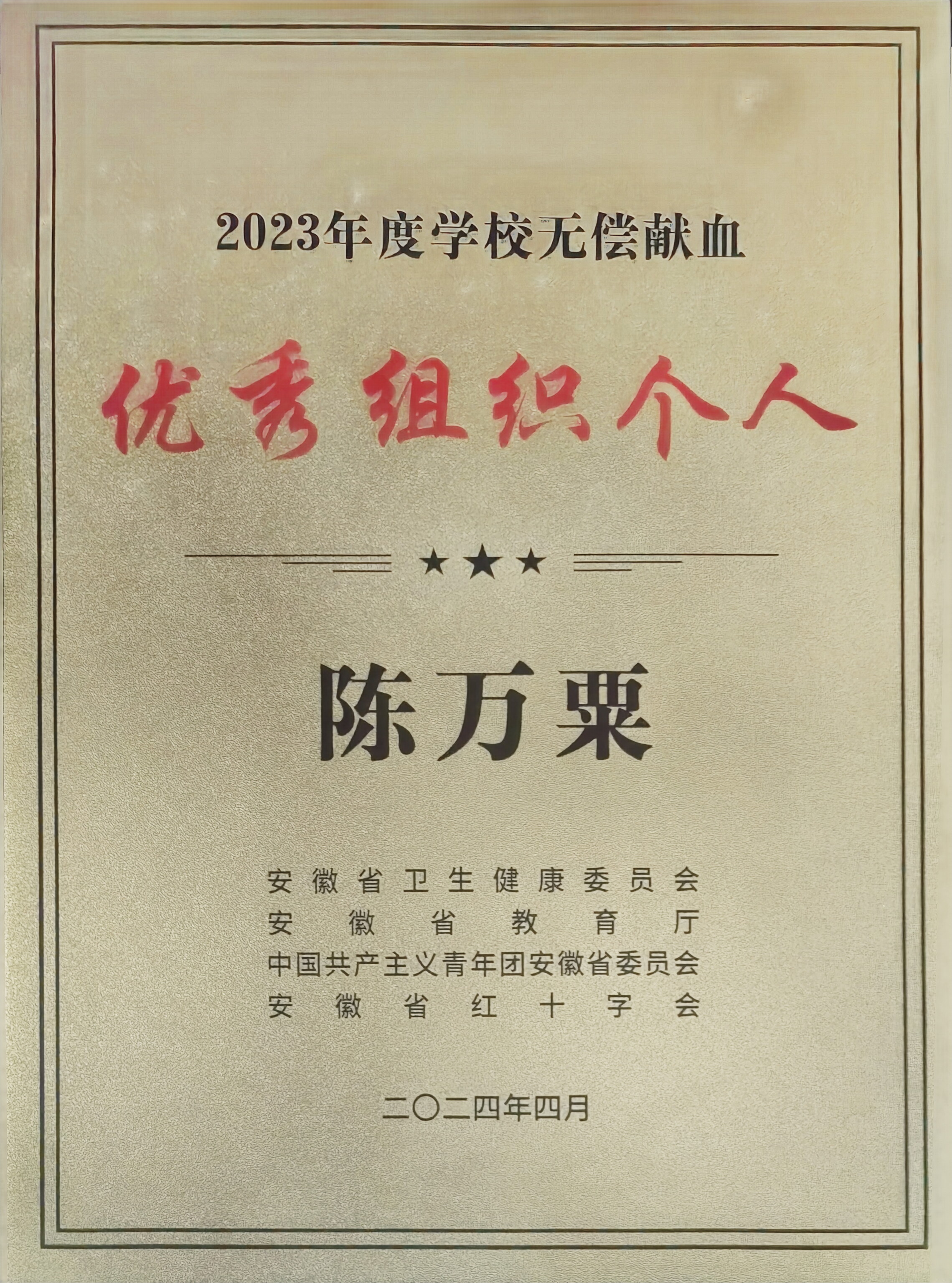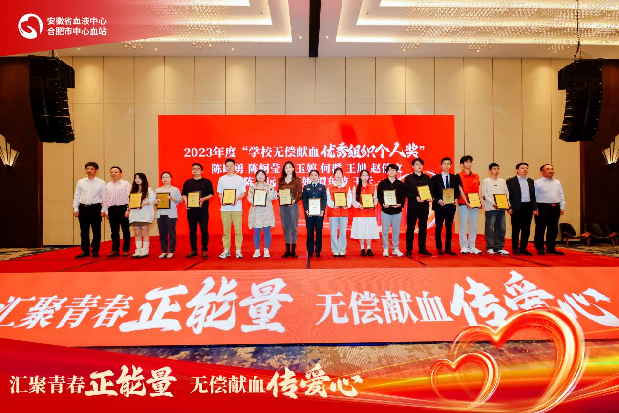 4月26日,由省卫健委、省教育厅、团省委、省红十字会、省输血协会指导,合肥市卫健委、市红十字会主办的2023年度驻肥高校无偿献血工作总结表彰暨2024年启动会顺利举行,我校获2023年度学校无偿献血“贡献集体三等奖”,青年志愿者联合会陈万粟同学被评为2023年度学校无偿献血“优秀组织个人”。