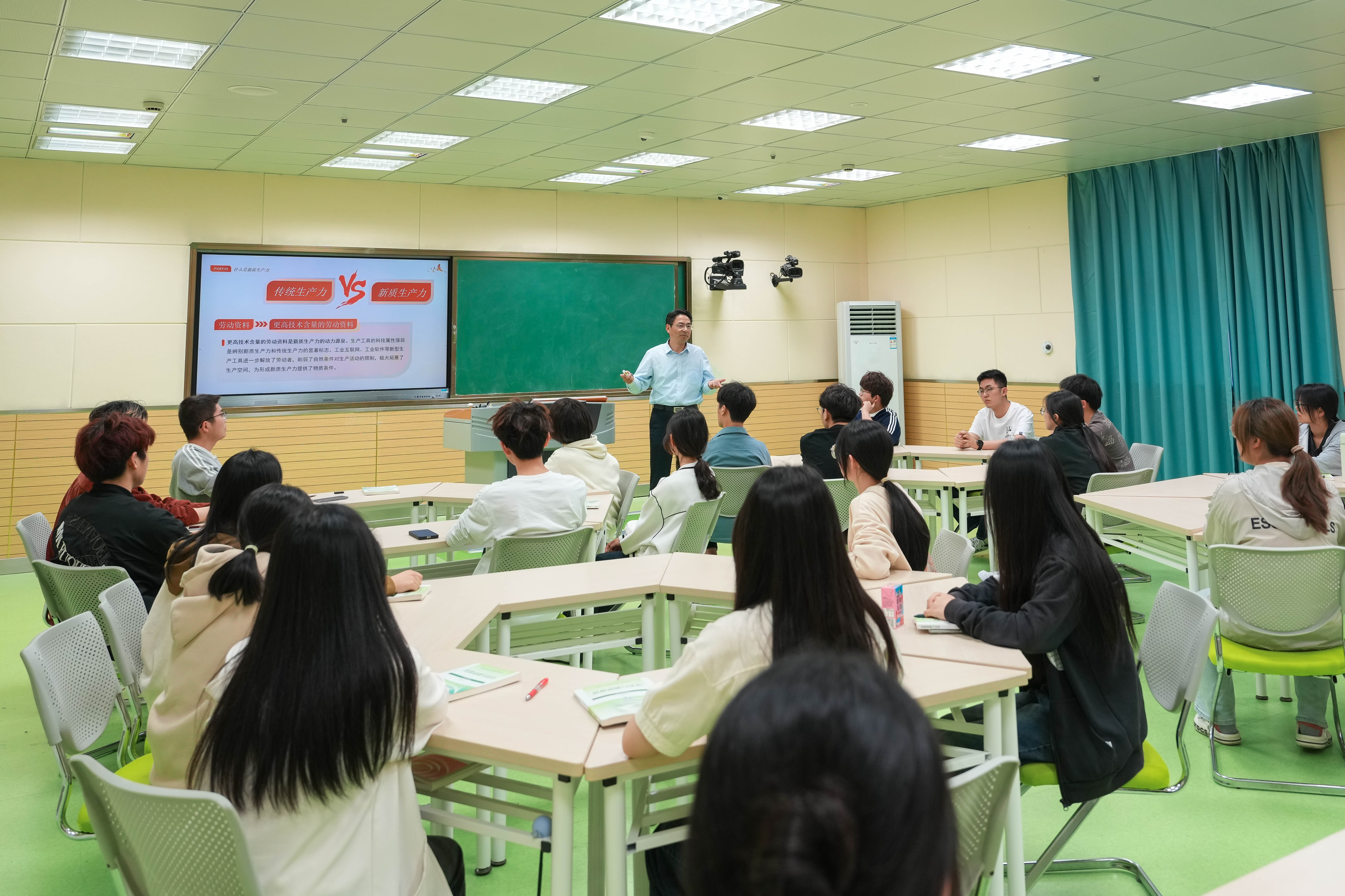 课堂上王杰才精准解读了习近平总书记关于新质生产力的重要论断,围绕什么是新质生产力、为什么要加速形成新质生产力和发展新质生产力我们能做什么三个方面进行了系统阐释,对发展新质生产力的核心要素作了重点剖析。王杰才从生产力的三要素对比分析传统生产力与新质生产力的区别,从历史的维度解读不同社会形态下生产力与生产关系的发展特征,从现实的需求角度探析发展新质生产力是摆脱传统经济增长方式,摆脱传统生产力发展路径的必然选择。立足学生的实际,王杰才呼吁我校学子要高标准,学好理论课程,善于独立思考,具备创新意识;要高素质,掌握专业知识,善长实践操作,具备团队精神;要高要求,练就技能技巧,善用新兴技术,具备广阔视野;要高站位,勇担社会责任,善攻难点卡点,具备家国情怀。