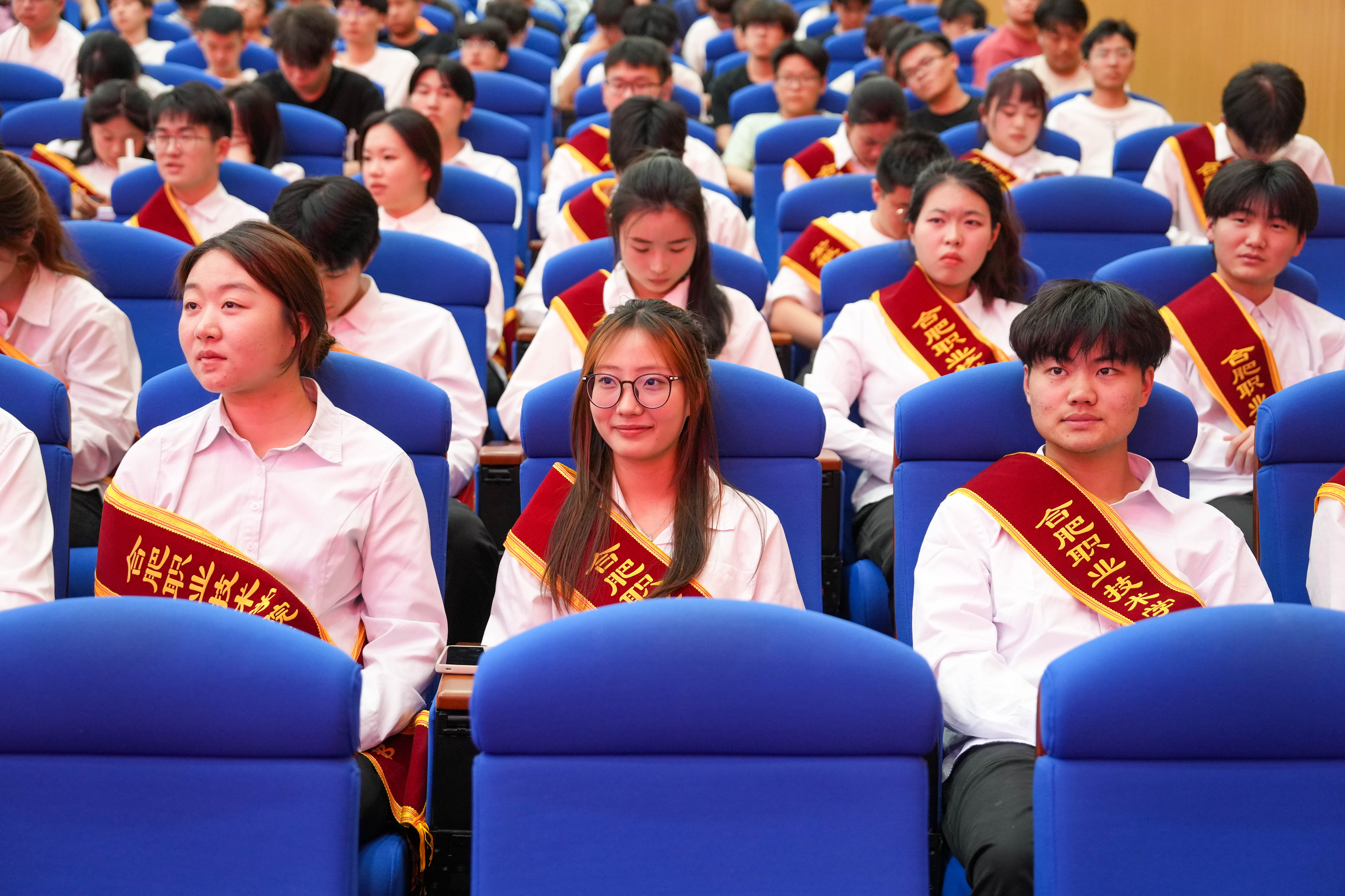 随后进行的是新团员入团教育仪式。各二级学院团总支书记为新团员们佩戴团徽,2024年度新发展团员以最洪亮的声音和最饱满的精神状态面对鲜艳的团旗进行宣誓。一面团旗就是一种信仰,一枚团徽就是一份力量。新团员们将继承和发扬五四精神,牢记誓词,坚定不移听党话、跟党走,为共产主义事业而奋斗。