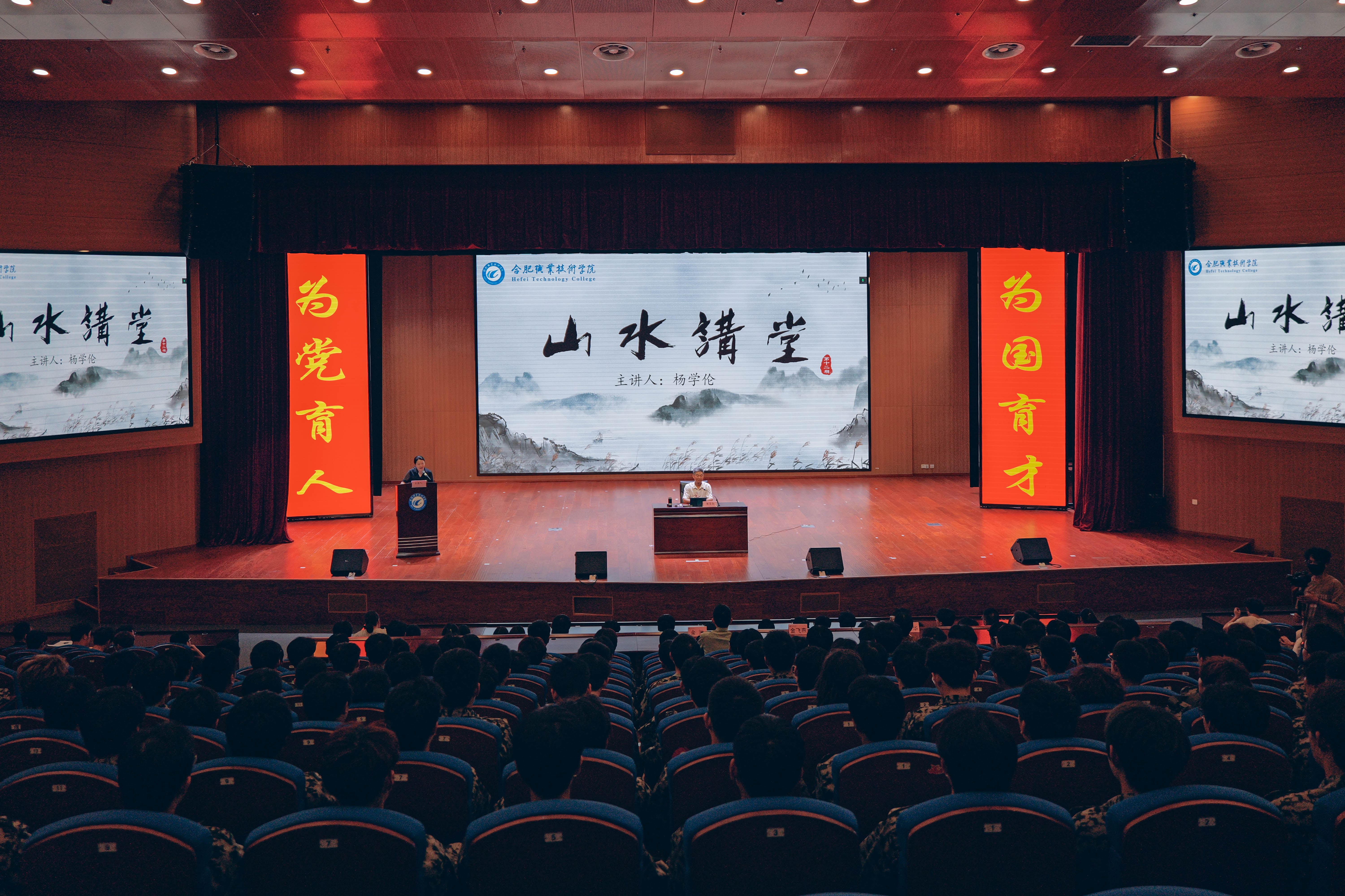 9月18日下午,山水讲堂第十二期之国防教育暨征兵宣传讲座在两校区大学生活动中心举行。活动特邀安徽省军区原副政委杨学伦少将主讲,校党委副书记金飞燕主持,巢湖市人武部政委余洲受邀参加,校党委委员、宣传统战部魏华,学生处负责人,新生班级辅导员、新生等近1100名师生参加。