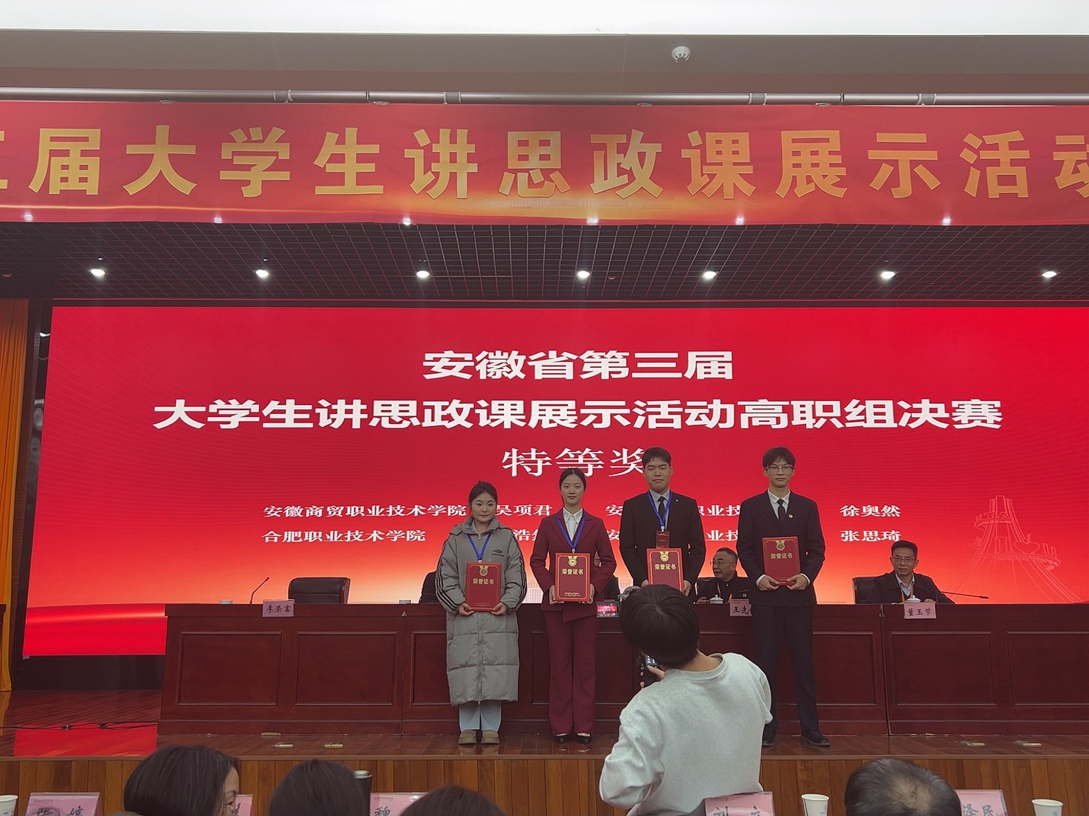 安徽省决赛中斩获佳绩。决赛共有来自全省21所高职院校的32支高职队伍进入决赛,我校共2组作品冲进决赛。选手们围绕《习近平新时代中国特色社会主义思想概论》《毛泽东思想和中国特色社会主义理论体系概论》《思想道德与法治》《形势与政策》四门课程中的有关章节或专题进行现场展示。严谨的教学设计、丰富的教学内容和精彩的现场展示,呈现了一堂堂精彩纷呈的思政课,赛出了选手们的水平和风采。经过激烈的现场角逐,我校斩获特等奖1名、二等奖1名的优异成绩。