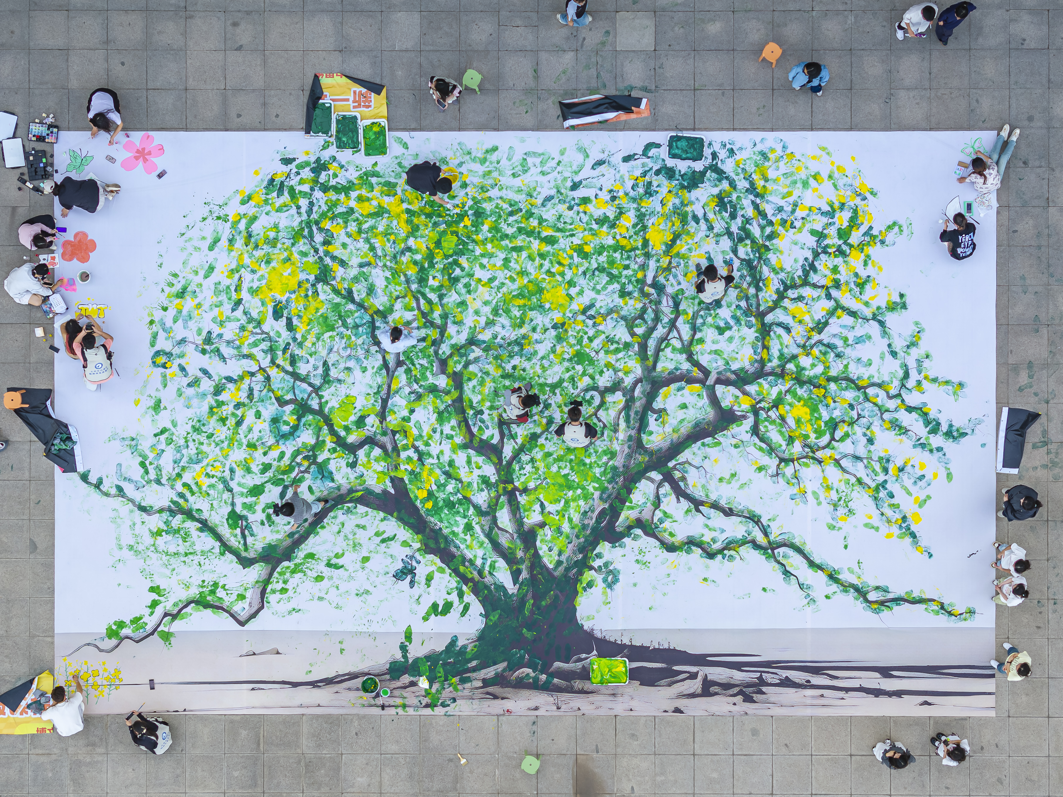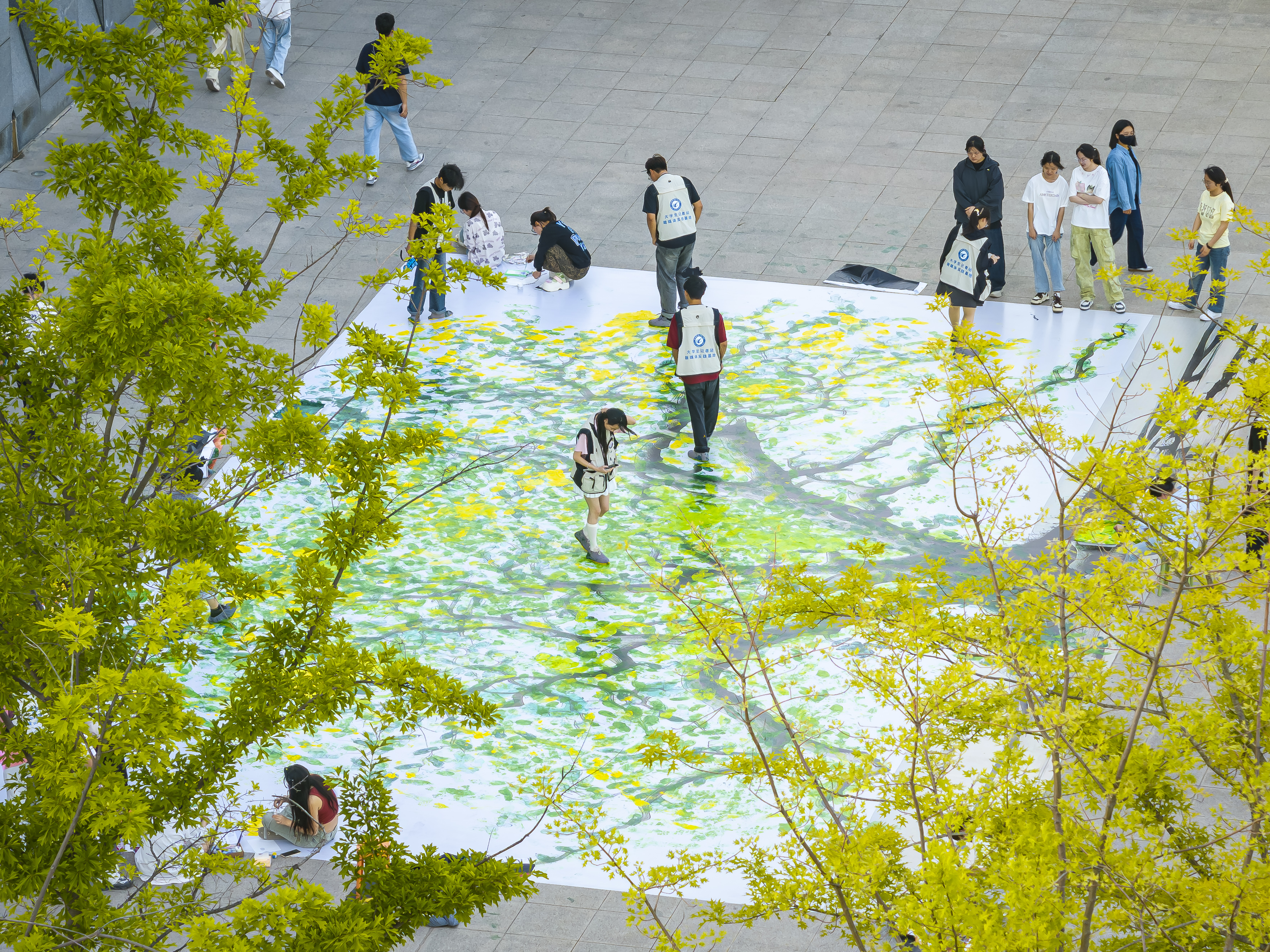 活动现场,一副巨大的的枯木绘画躺卧在校园内汇心湖畔地面。参与者们在校大学生记者站同学们的引导下有序踏上枯木,每一步都化作颜料中的一抹绿意。随着脚步的起落,深绿、浅绿、鹅黄的色彩层层晕染,枯木的纹路逐渐被生机勃勃的“枝叶”覆盖。更有同学手持画笔,在“绿叶”间点缀上粉嫩的花朵、嫩绿的小草与灵动的蝴蝶,一幅“枯木逢春”的生态画卷在足尖与笔触间徐徐展开。