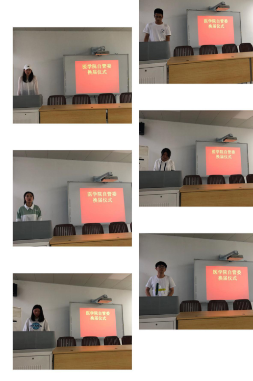 随后,新一届自管委班子成员逐一作表态发言。大家纷纷表示将会沿着上一届学长学姐的足迹,不忘初心,砥砺前行,奋发上进,为医学院的学生工作贡献自己的力量。第一届自管委主席王银忠也送给学弟学妹一席话:自管委是一个锻炼人的好地方,在这里无论是动手能力,协调配合还是与人沟通交流都会得到充分的锻炼,与此同时大家也会收获一起工作的“革命友谊”,希望学弟学妹们享受在自管委的美好时光。