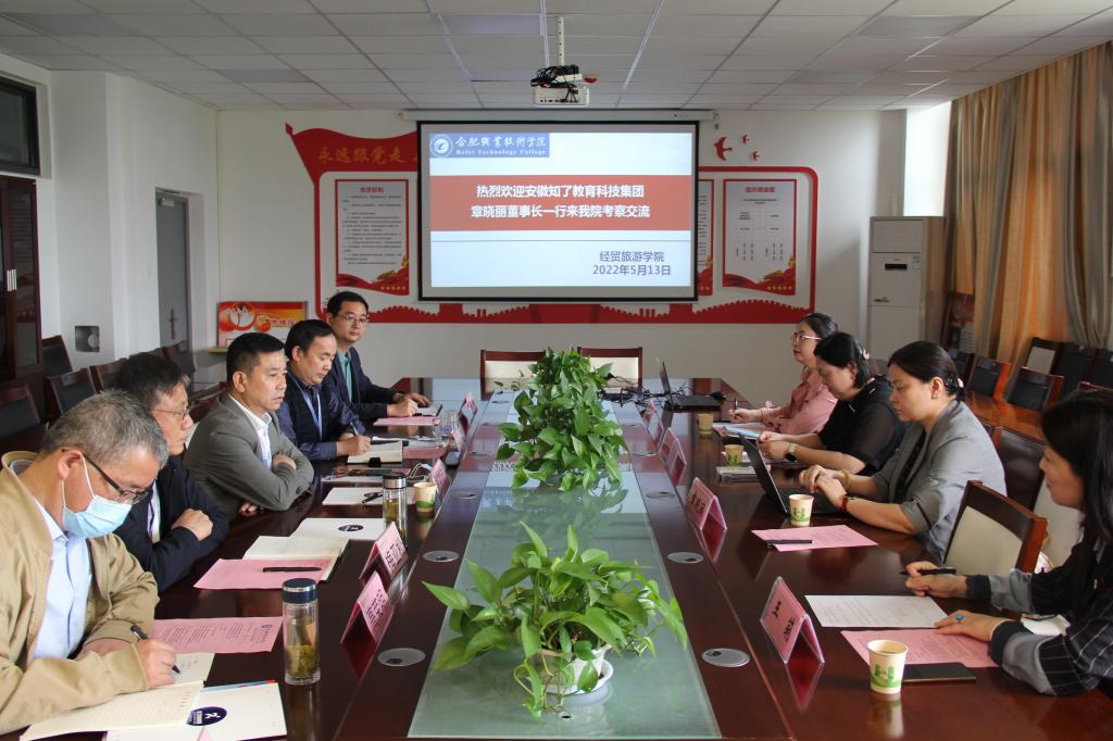为进一步深入贯彻“产教融合、校企合作”职业教育理念,5月13日上午,我校经贸旅游学院在会议室与安徽知了教育科技集团(以下简称知了公司)洽谈校企合作事宜。校党委委员、副书记胡其云,经贸旅游学院党政领导,合职-梦森双创基地负责人吴捷总经理,知了公司董事长、校长章晓丽,副校长宣媛媛,总经办主任徐郡忆,办公室主任王莉出席洽谈会。