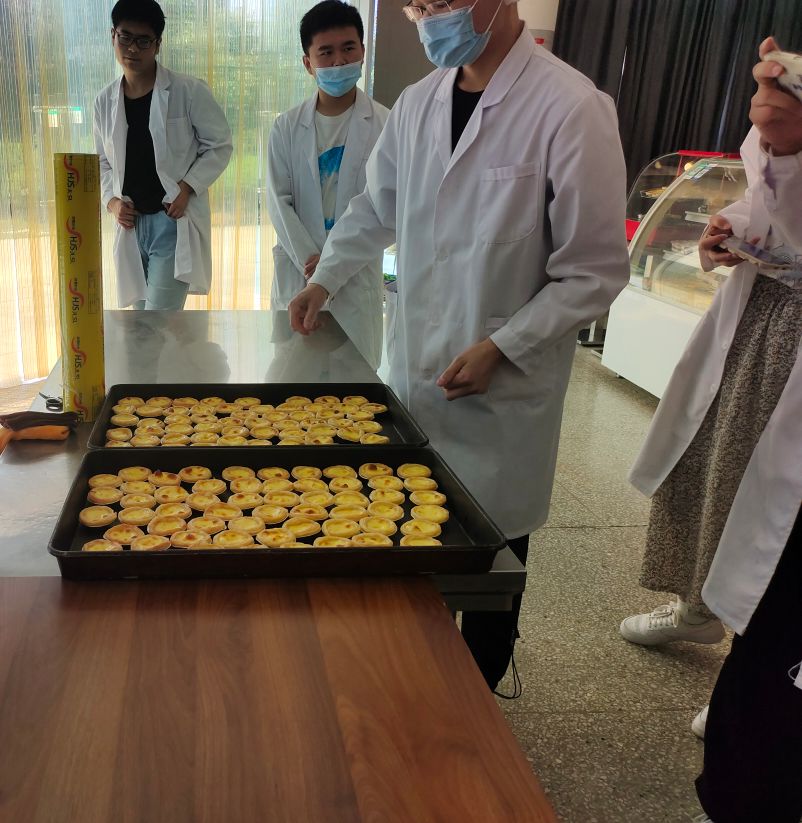 为保证活动成功举办,在生物工程学院指导老师许睿和郑学斌的带领下,来自20级食质、食检专业的部分同学,利用课余时间亲手制作了葡式蛋挞,并改良蛋挞配方,加入食品着色剂和增稠剂,创新产品类型,开拓学生的创新思维,提高学生运用理论知识应用实践的科研能力。本次活动前来观看体验制作人数达五百余人次。