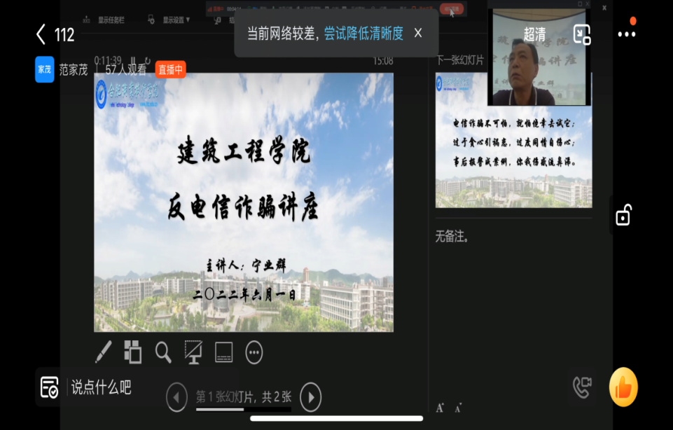 6月1日下午,该院党总支书记宁业群在鼓山校区图书馆二楼报告厅以钉钉直播和线上、线下相结合的方式面向全院师生上了一堂生动的“反电信诈骗”专题教育课。
