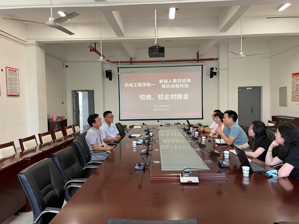 为进一步加强校企合作,深化产教融合,6月13日下午新站区人事劳动局携博讯光电(合肥)股份有限公司一行来访机电工程学院,校党委委员、办公室主任王海,机电工程学院党总支书记王克勇,院长胡木林和相关教师参加了此次对接会。