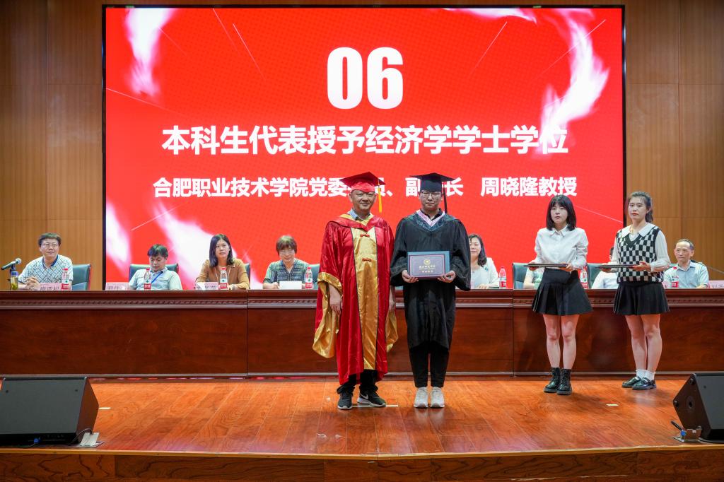 周晓隆教授宣读2022届经济与金融专业毕业生学位授予决定,11位毕业生代表有序走上前台,周校长与他们握手,为他们拨正流苏,颁发毕业证书、学士学位证书。