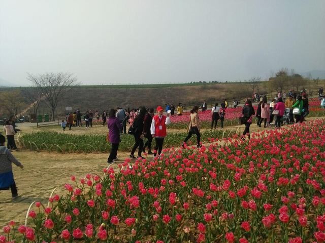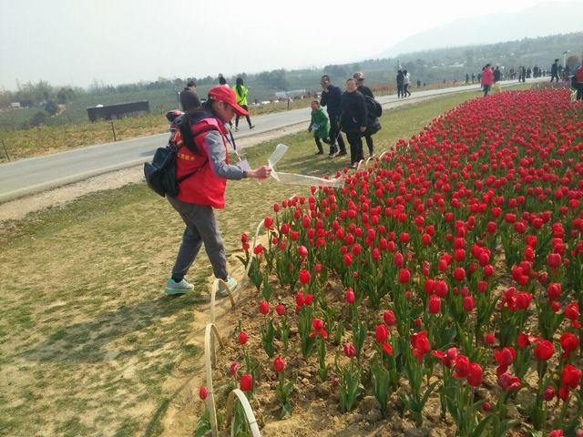 3月26日早上9点,30人的青年志愿者队伍到达郁金香高地开展志愿服务活动。他们头戴小红帽,身着志愿者服装,每个人都用微笑和行动服务来来往往的游客,并保护那些美丽的花花草草。