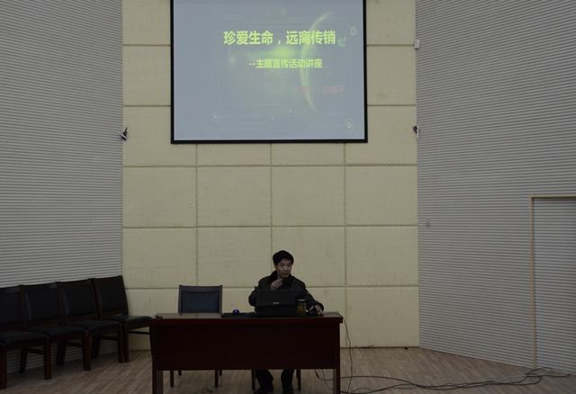 12月17日下午,生物系在图书馆二楼多功能报告厅举办了主题为“防止传销进校园--珍惜生命,远离传销”安全知识讲座。讲座由院学生(保卫)处处长祝建平主讲。生物系相关负责人、班主任辅导员及各年级团干部、各寝室长共200多学生参加了本次讲座。