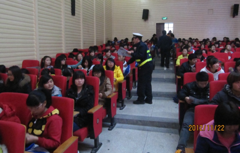 张鸿飞指导员首先通报了近几年我市发生的交通事故及事故造成的死伤和损失情况,结合我们身边的交通事故案例进行分析,用血的事实说明违反交通规则、违背交通道德带来的种种危害;接着张指导员就我们面临的交通环境、交通事故发生原因、交通法规知识、交通事故发生后如何处理等几个方面进行了讲述;最后,结合我校学生学驾驶较多的现象,张指导员特别指出大学生学驾驶应注意的问题,并要求每位同学都要自觉掌握交通安全知识,增强安全防范意识,遵守交通安全法规,提高自我保护能力,做到“一停二看三通过”,高高兴兴学习,平平安安生活。