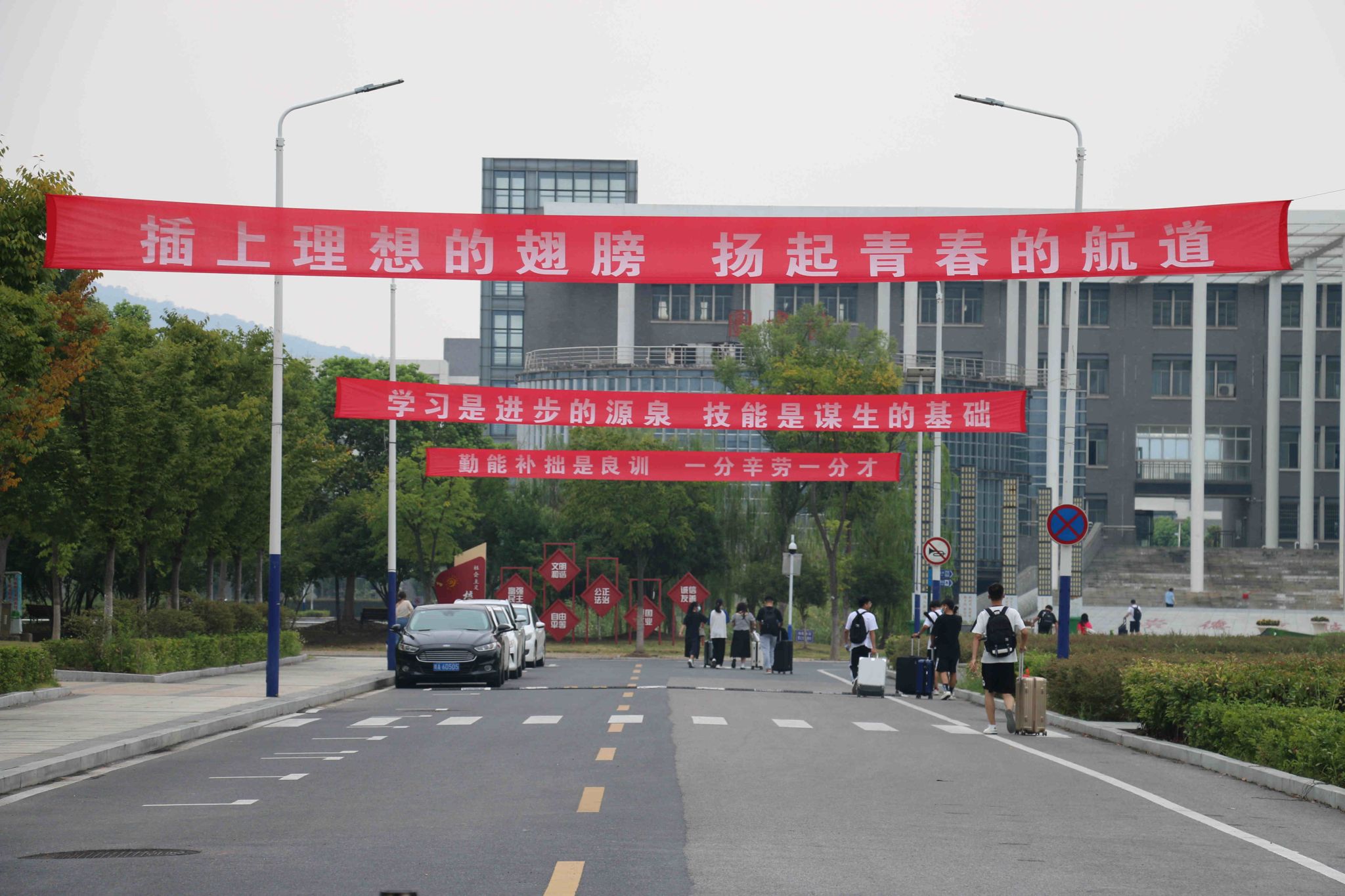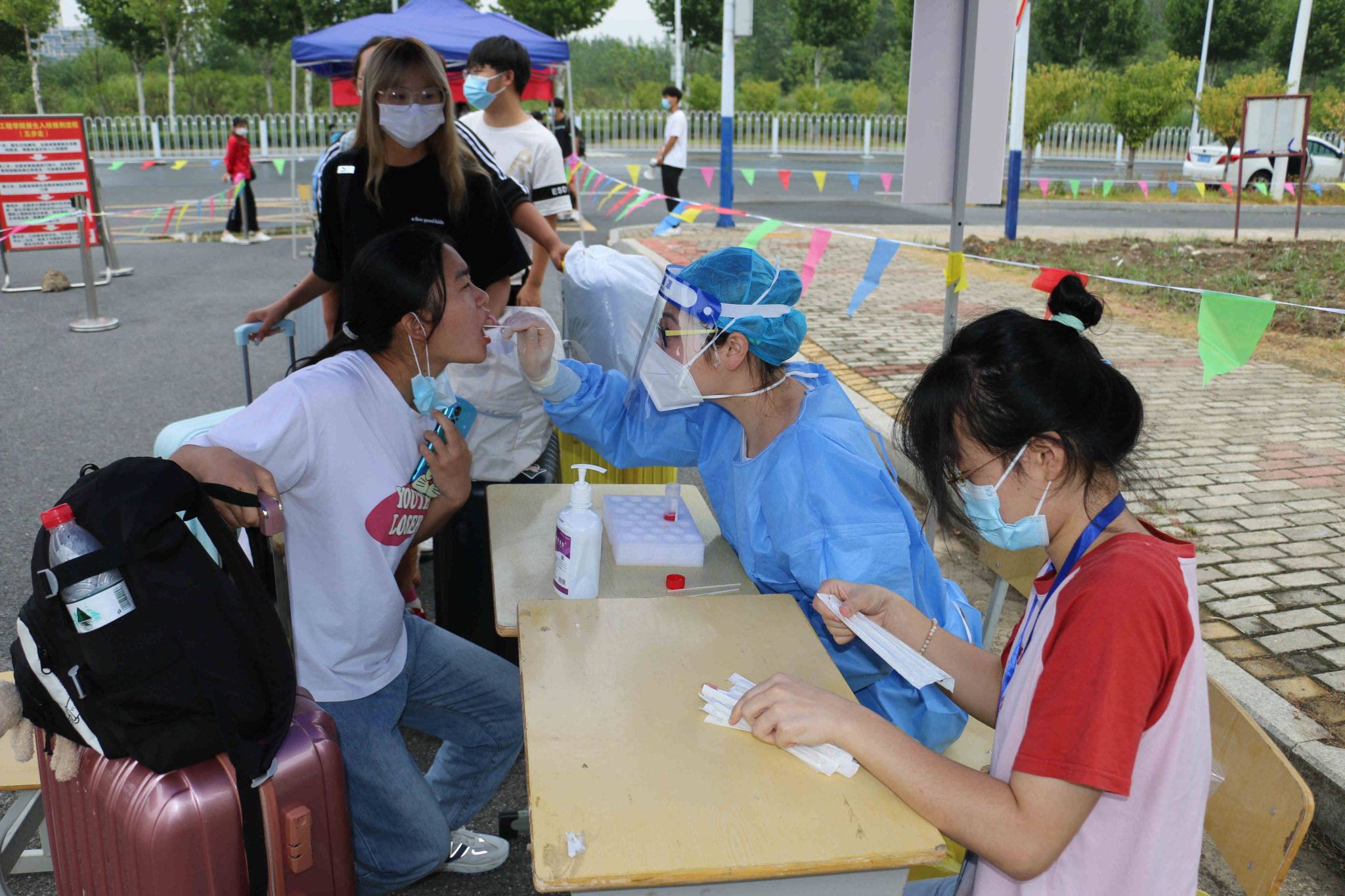 返校时,学生佩戴口罩,持学生证保持间距排队进入校园,依次进行核酸检测、测温、查验健康码、行程码、48小时核酸检测结果、行李消毒、换口罩等环节后,方可进入校园。现场井然有序,学管和学生志愿者们紧密配合。