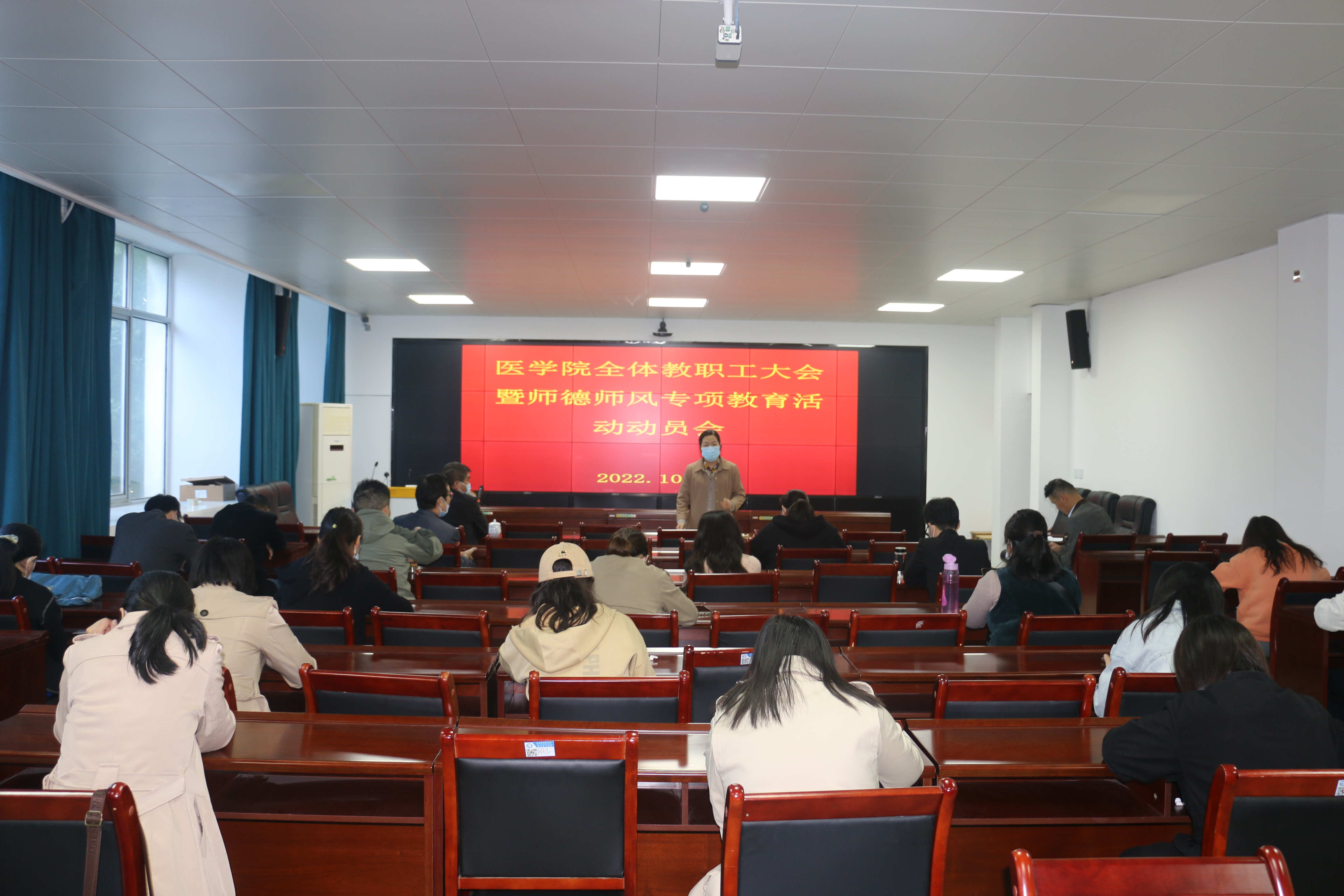 10月12日下午,医学院在医学楼二楼智慧会议室召开全体教职工理论学习暨师德师风专项教育活动专题会议。本次会议严格按照当前疫情防控要求,采取了“线上+线下”结合的形式进行。院长王荣俊、党总支副书记邹华兵和部分教师代表在现场参会,其余教师则通过钉钉线上参会。会议由党总支副书记(主持工作)孙美兰主持。