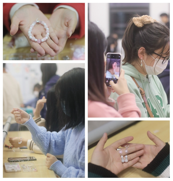 活动吸引了不少同学参加,活动现场,桌子上摆满了各式各样的珠子、夹子、耳夹、流苏配件等材料。同学们认真听社团负责人讲解如何做出好看的耳饰,生怕错过某个让耳饰赏心悦目的细节。为了让耳饰好看有特色,大家在一起互相探讨交流想法,彩色琉璃珠、吊坠、流速吊穗、流水链等零零碎碎的小东西,通过创意设计、手捏、绕线、弯钩、定型等工序,逐渐变成了一对对精致漂亮的耳饰。