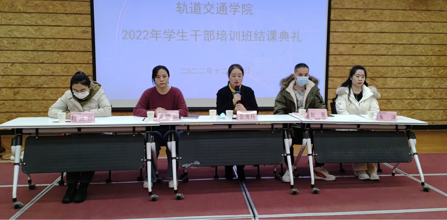 为进一步增强学生干部的爱国意识、综合素质和服务意识,培养学生干部的学习实践能力,轨道交通学院于11月开办了学生干部培训班。12月6日下午该院在大学生活动中心一楼报告厅举行了培训班结业典礼,党总支书记佘海月、学管班主任赵喜、团总支书记吴明丽,相关辅导员及全体参训人员参加本次结业典礼。