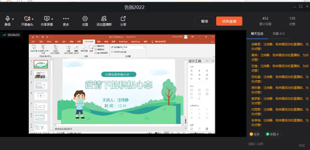 为扎实做好现阶段生物工程学院学生的心理健康教育工作,引导广大学子及时调控不良情绪,以积极心态进行自我防护,增强其应对新挑战的心理免疫力,12月31日下午,生物工程学院心理老师汪老师展开了一场主题为“疫情下的积极心态”的线上讲座,此次讲座面向21级、22级全体学生。