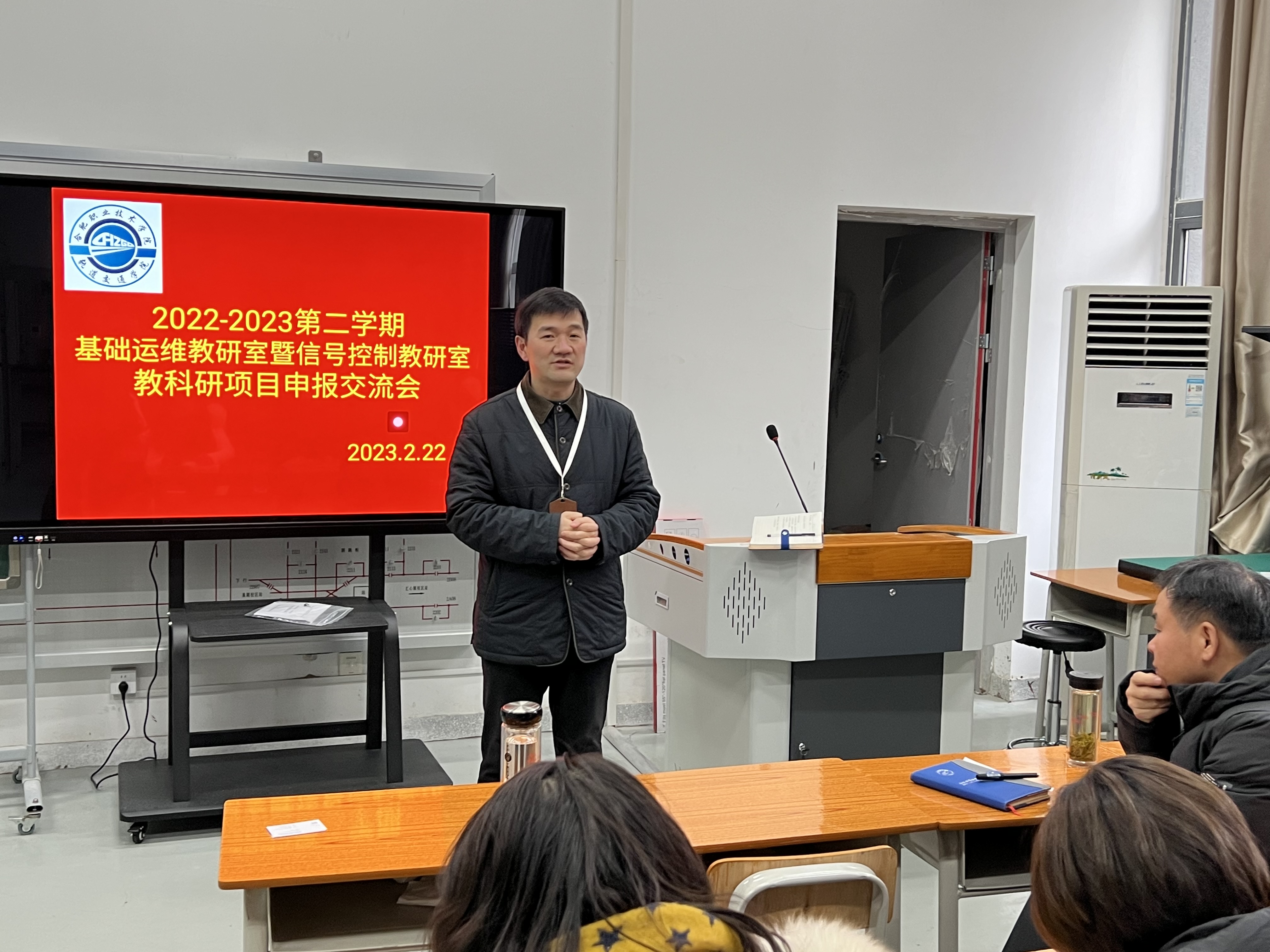 为响应学校关于深化教科研工作的号召,规范教科研项目申报及进程管理工作,2月22日下午,轨道交通学院2022-2023第二学期基础运维教研室暨信号控制教研室教科研项目申报交流会于轨道楼101室召开。副院长杨光明(主持工作)教授、副院长劳志鸿教授及学院全体青年教师参加了交流会,交流会由副院长劳志鸿主持。