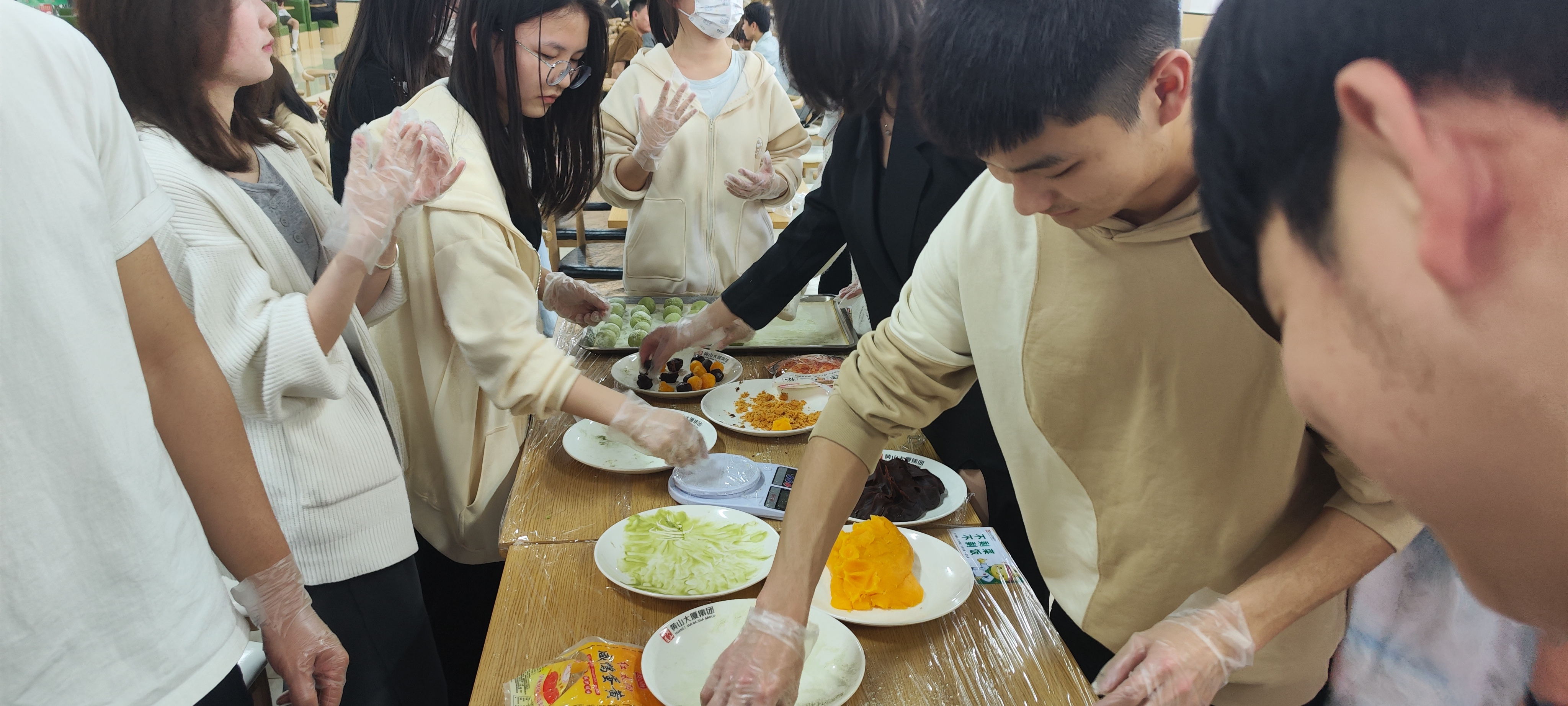 活动一开始,活动志愿者向大家讲解寒食节的来历后,便将制作青团的材料摆上桌,接着由专业师傅展示青团制作过程。正如清代美食家袁枚在《随园食单》中那般描写“捣青草为汁,和粉作团,色如碧玉”。待注意事项尽数知悉,现场气氛立刻活跃了起来,大家纷纷撸起袖子,揉面团、加面粉、拌馅料、包团子……青团中可包馅料有四种,分别是豆沙馅、奶黄馅、肉松馅以及咸蛋黄馅,同学们可以根据自己喜好自由添加。虽然大多数同学都是第一次制作青团,动作不太娴熟,但通过彼此交流和专业师傅的指导,最终大家都成功揉出了一个个青翠诱人的青团。