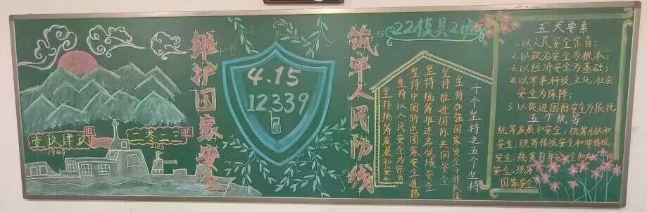 本次黑板报以“4·15全民国家安全教育日”为主题,贯彻总体国家安全观,增强全民国家安全意识和素养,夯实以新安全格局保障新发展格局的社会基础。机电工程学院22级各班级积极准备、认真设计,在沉浸式的绘画中,同学们更加深入理解总体国家安全观,增强自身维护国家安全的责任感、使命感和自觉性、主动性。