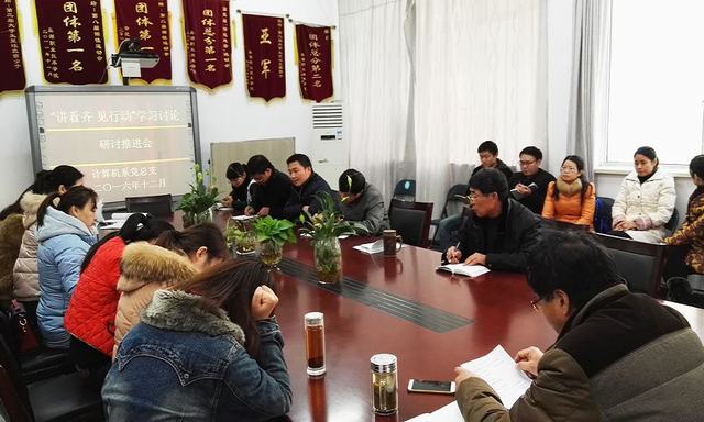 12月21日下午,计算机系党总支在信息楼会议室召开“讲看齐、见行动”学习研讨推进会,计算机系全体党员参加了会议。会议由系总支副书记梅亚松同志主持。