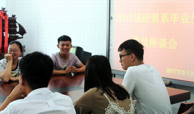 此次会议包括三个环节。首先,由经贸系学生党支部书记王文俊为全体毕业生党员上在校期间最后一次党课。王文俊以“践行四讲四有做合格共产党员”为题,详细介绍了“四讲四有”的涵义,希望全体党员同学身体力行,努力争做讲政治、有信念,讲规矩、有纪律,讲道德、有品行,讲奉献、有作为的合格共产党员。与会全体党员还在周婷老师的带领下,重温了入党誓词。随后,由经贸系学生党支部组织委员周婷老师向全体党员同学介绍了党组织关系转接相关事宜及注意事项。最后,全体毕业生党员进行了交流座谈。座谈会上,22名毕业生党员结合自己的学习工作实际畅谈了自己对党的认识,与大家分享了自己在大学里的收获,特别是踏上实习岗位一年来的经历与感悟。同时也纷纷表达了对党组织培养的感激之情,毕业生党员在发言中提到最多的词就是“成长”、“学习”与“坚持”,也道出了2017届毕业生共同的心声。他们表示,将时刻牢记党的宗旨使命,在各自的岗位上发挥先锋模范作用,为母校争光,以优异的成绩回报母校、回报社会,衷心祝愿母校的各项事业蒸蒸日上。毕业生党员还对学院的教育教学等方面提出了一些建设性的意见。