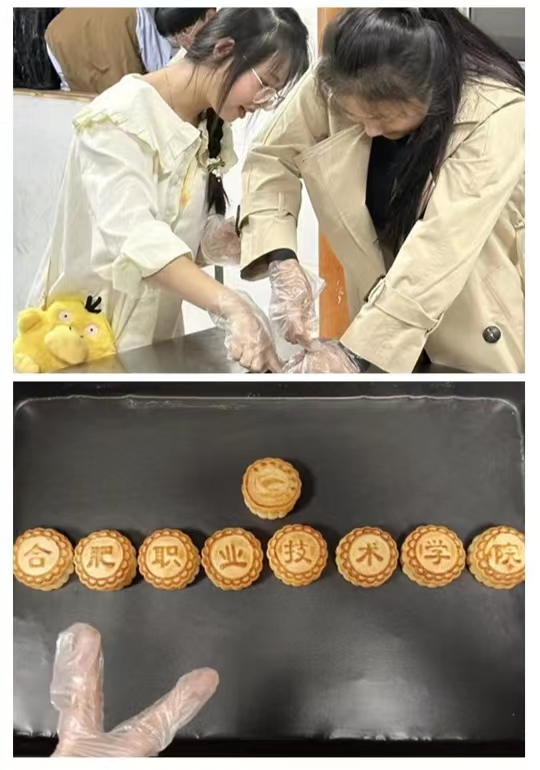 9月23日晚同学们齐聚一食堂三楼,在指导老师的指导下,大家齐齐撸起袖子,称重、揉面、包馅、压模一气呵成。不一会儿,印有醒狮、“合”“肥”“职”“业”“技”“术”“学”“院”等图案的月饼就跃然于台面。一时间,食堂三楼充满了欢声笑语,温馨欢愉的中秋节日气氛扑面而来。