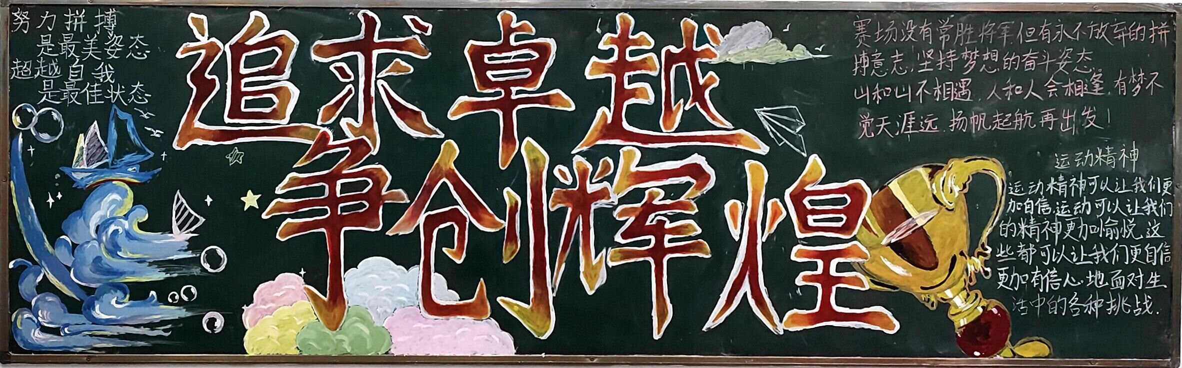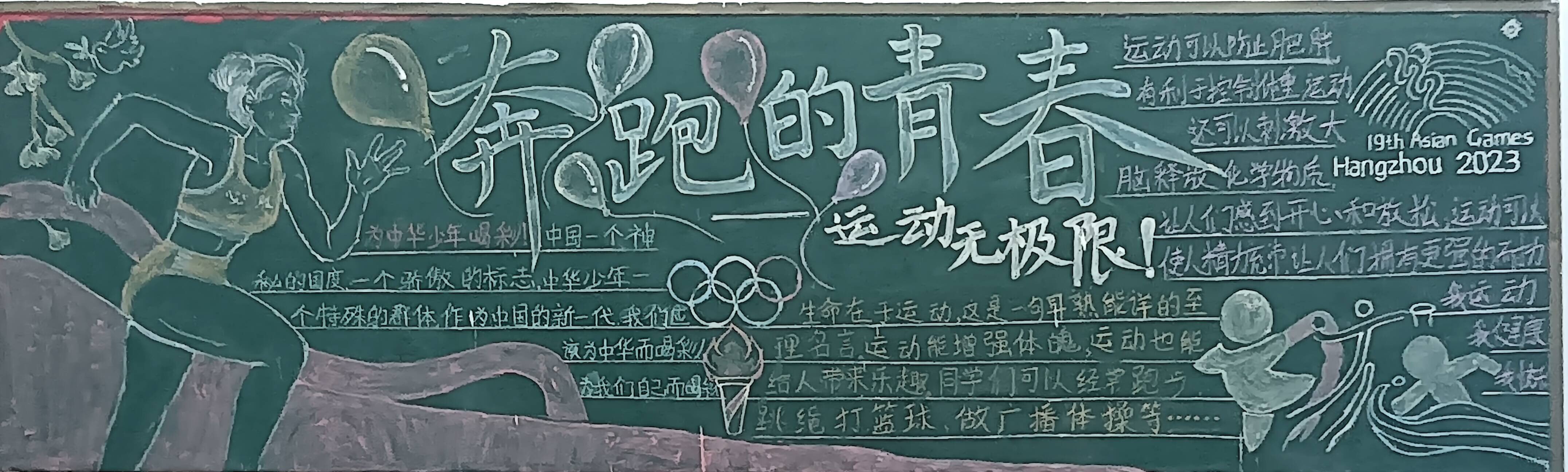 各班同学积极参与到板报的设计中,绘画出他们心中运动会的模样,将自己美好的期待与盼望都在板报中展现出来。板报不仅文字内容丰富深刻,同学们的绘画部分同样显现出了体育精神的具象化表达。板报画出了操场、跑道、运动员、运动标语等,有的同学们挥动着手中的画笔,写上了自己对体育精神的理解;有的同学对着照片,画上了自己喜欢的体育明星;还有的同学挂上一对羽毛球拍,富有创意,以表示对体育的热爱。象征着学生们对运动会的关注与期待。
