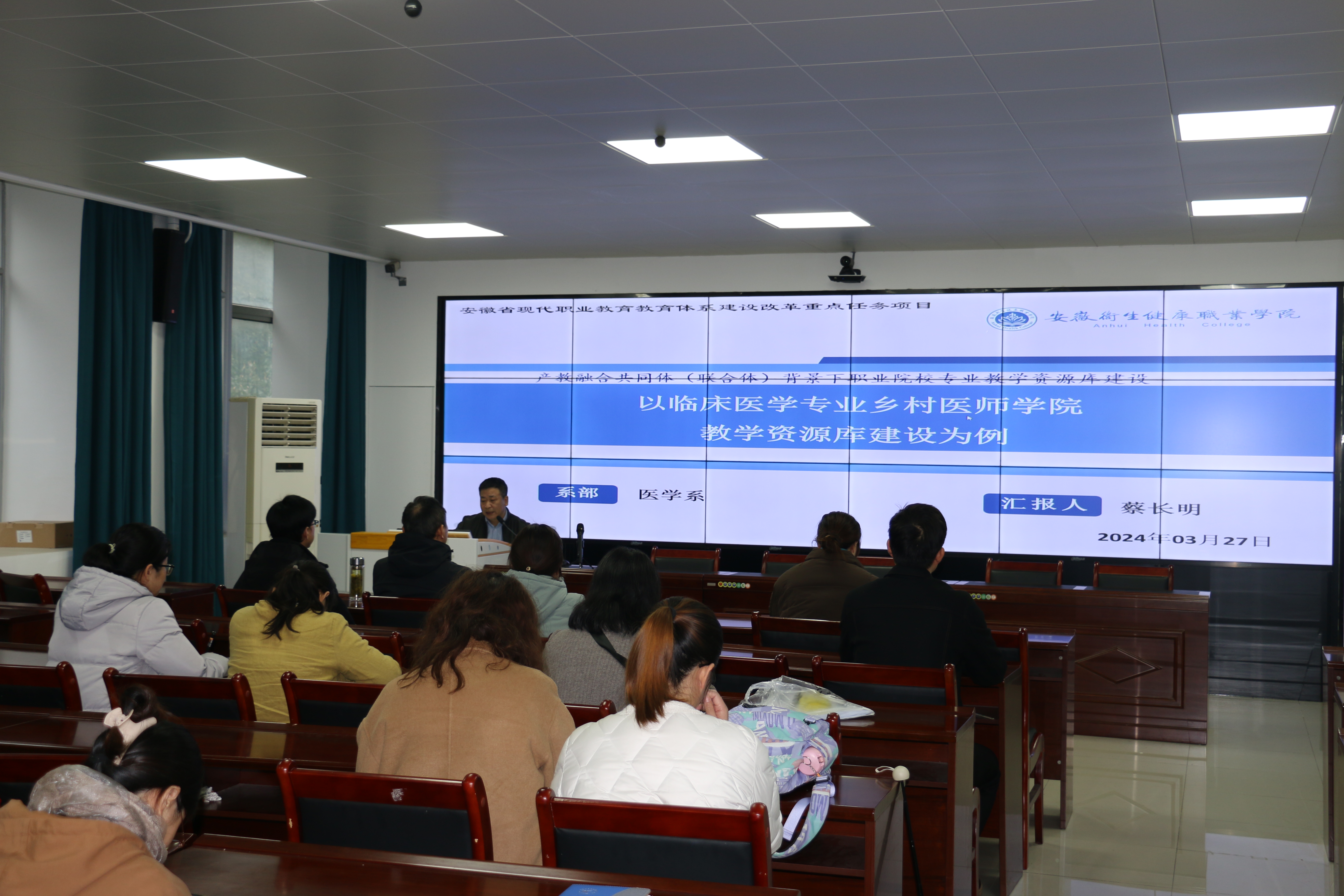 为使我校师生更好地了解产教融合共同体(联合体)背景下职业院校专业教学资源库建设暨临床医学专业乡村医师学院教学资源库建设,同时进一步了解安徽省乡村医生现状及培养模式,3月27日,医学院邀请安徽卫生健康职业学院临床医学专业带头人、培训部(乡村医师学院)主任蔡长明副教授来校开展专题讲座。医学院全体教师参加。