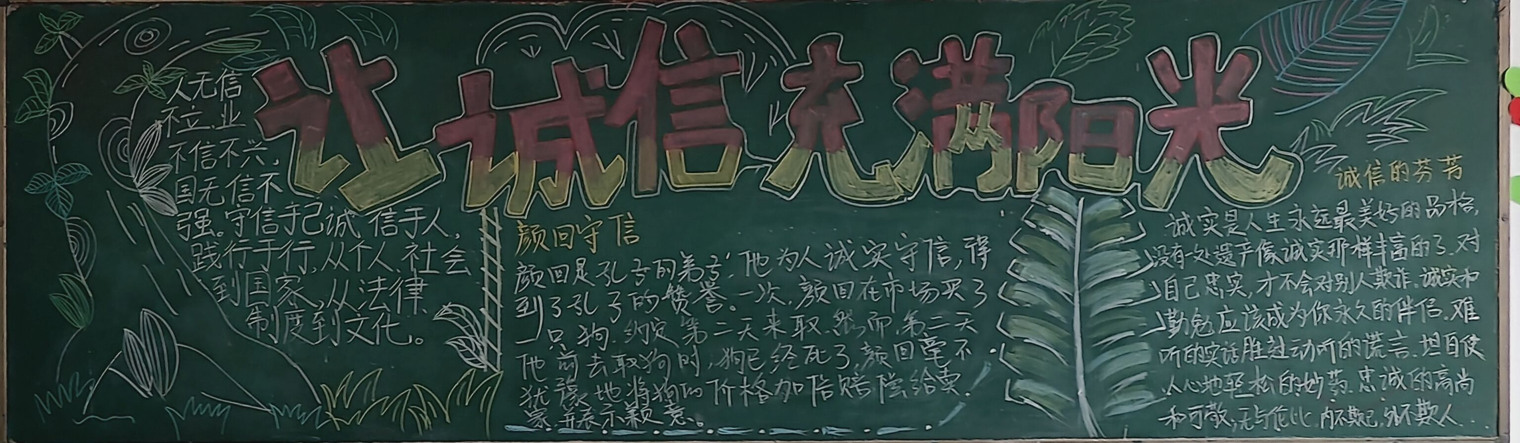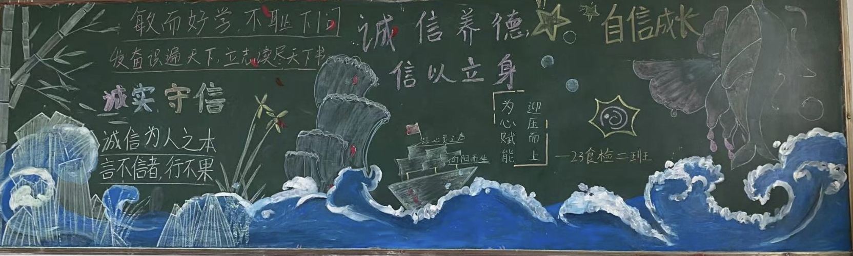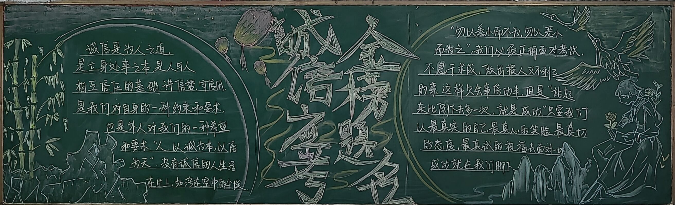 标题“诚信考试”字体刚劲有力,表明了学生对于诚信考试的重视,同学们巧妙地运用了色彩、线条和图案,使得整个黑板报美观又大方。在制作黑板报的过程中,学生们表现出了极高的热情和积极性,在内容、板书与文宇、插图与美工、排版与设计、标题与创新上各放异彩。他们自发组织团队,分工合作,共同探讨如何更好地呈现主题和内容,共同为黑板报的制作贡献着自己的力量。