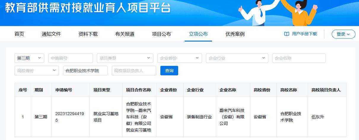 6月14日,教育部公布了第三期供需对接就业育人项目立项名单。由学校与蔚来汽车科技(安徽)有限公司共同申报的项目:合肥888集团学院—蔚来汽车科技(安徽)有限公司就业实习基地成功立项。