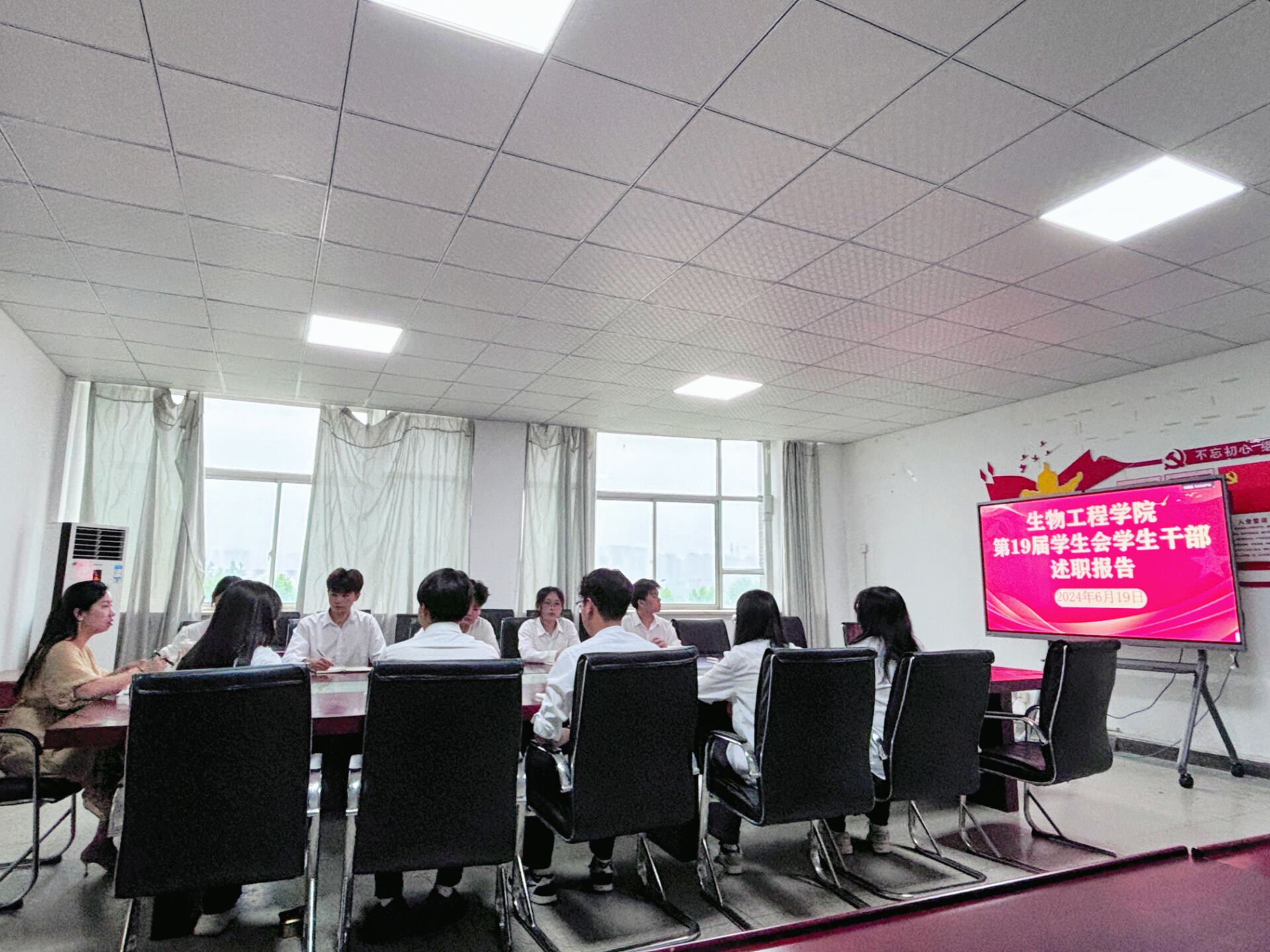 为促进生物工程学院学生会组织建设,提升服务学生的能力,6月19日,生物工程学院团总支在生化楼党员活动室组织召开本学期学生会干部述职评议暨学期工作总结会议,团总支书记肖昕和学生会主席团及各部门负责人参加本次会议 。