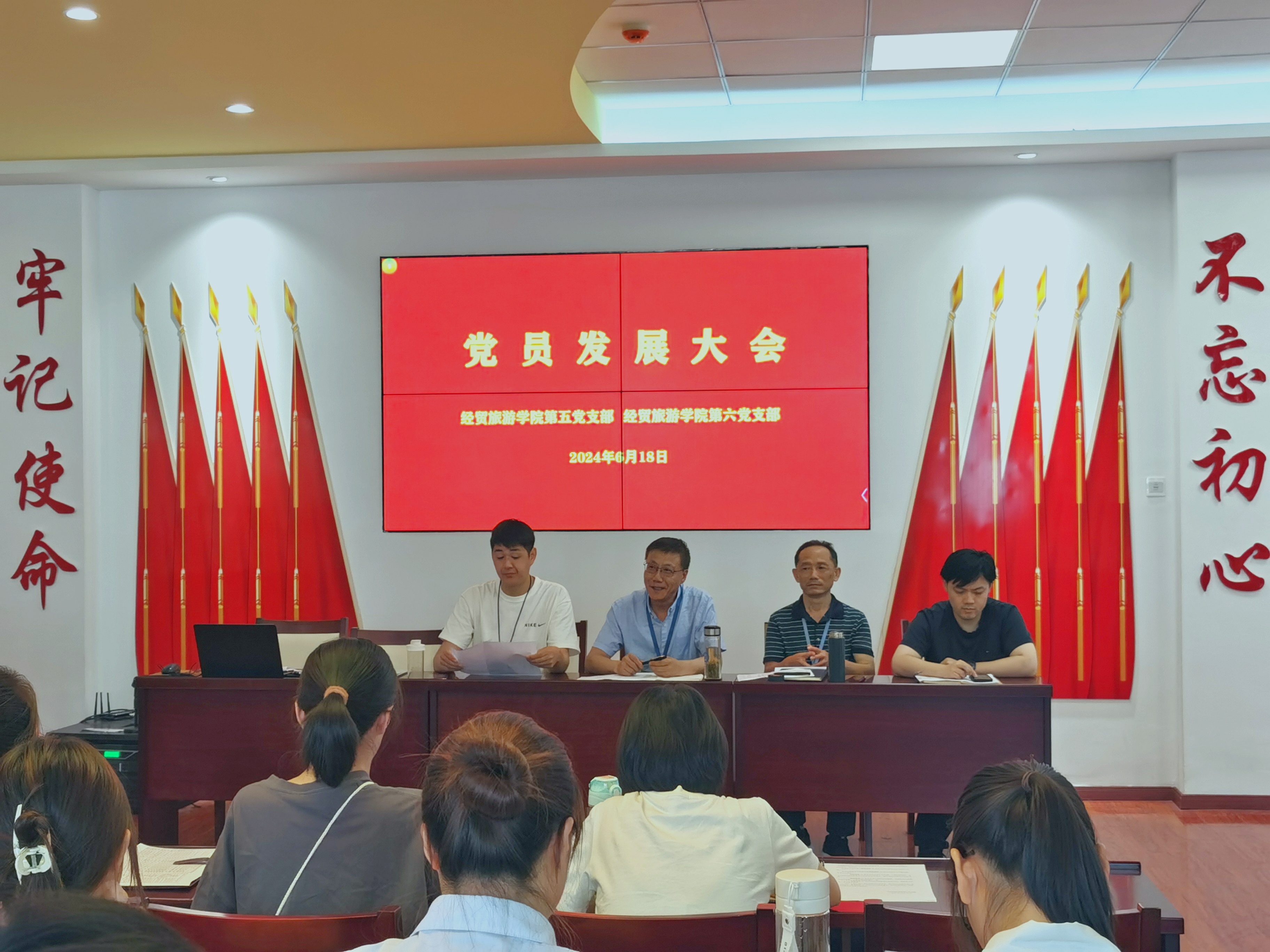 6月18日下午,经贸旅游学院第五党支部、第六党支部在经贸楼三楼党性体验馆召开党员大会,讨论接收闫雨牧等23名同志为中国共产党预备党员。会议由第五党支部书记王明明主持,两个支部的全体党员参加了会议。
