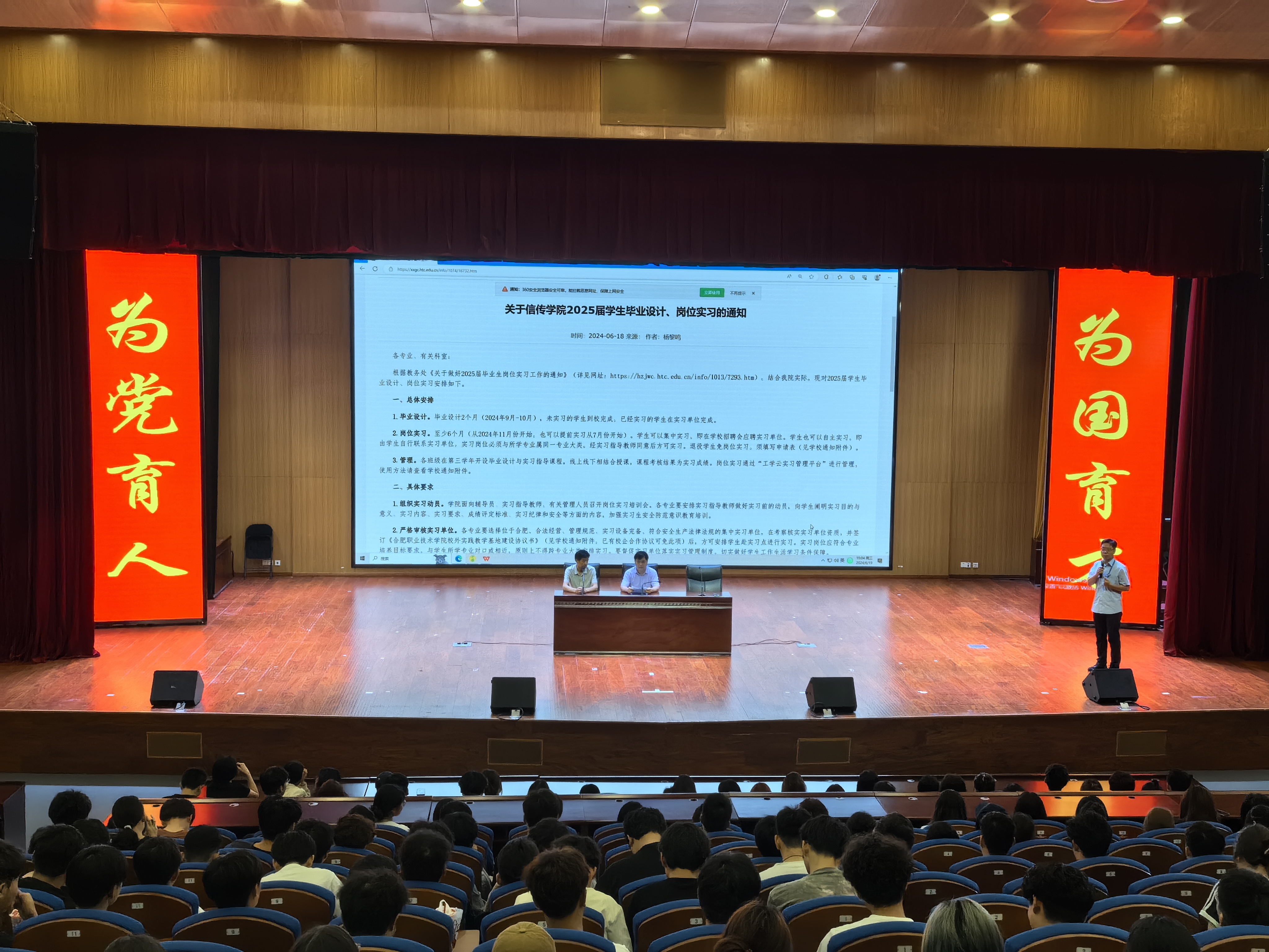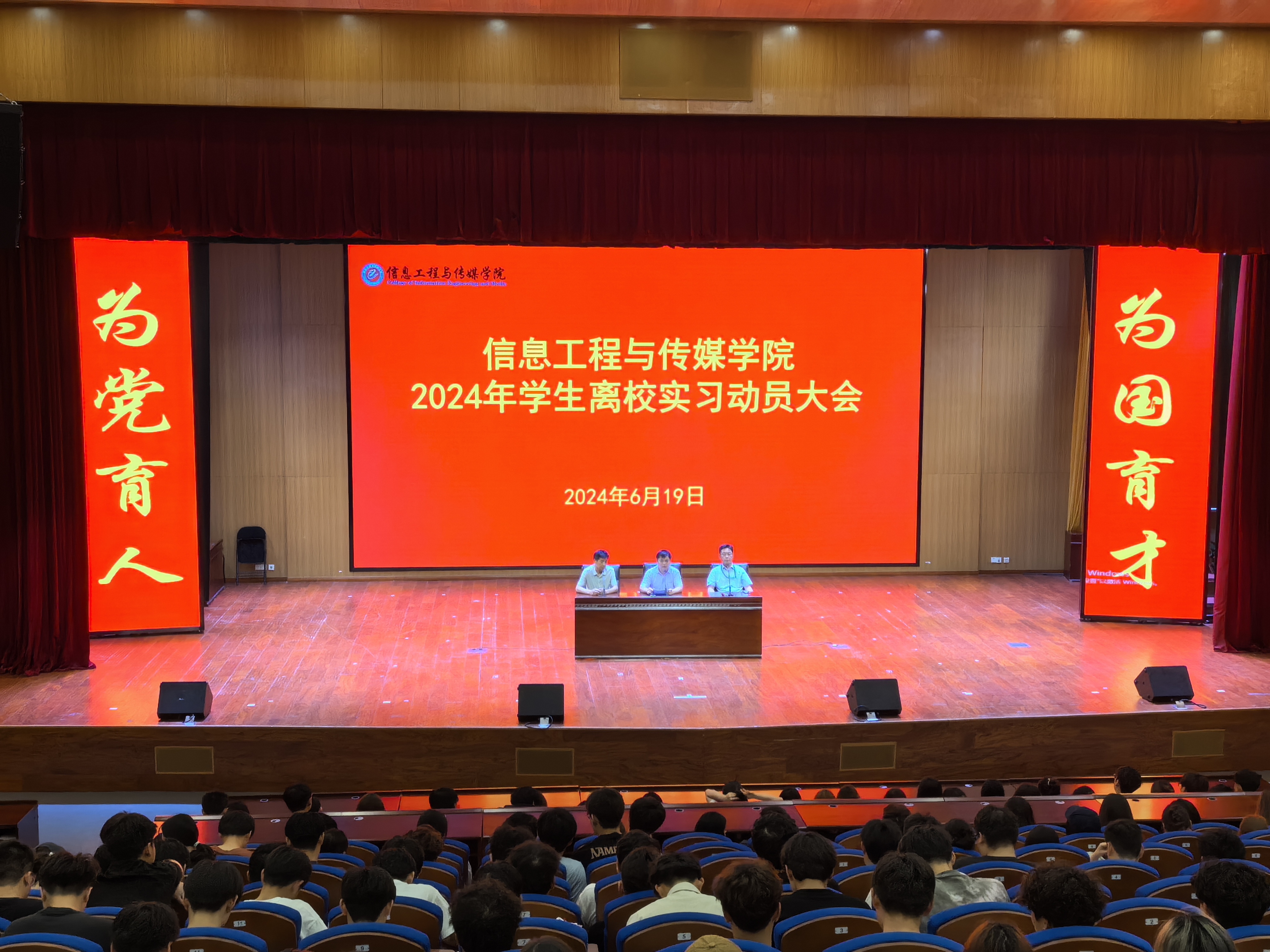 为进一步做好学生实习动员和文明离校工作,6月19日晚,信息工程与传媒学院在大学生活动中心召开2025届学生离校实习动员大会,会议分两场进行。会议由学院党总支副书记刘泽发主持,学院党总支副书记(主持工作)尹仕果、院长尹宗平、全体25届学生和辅导员参加了此次会议。