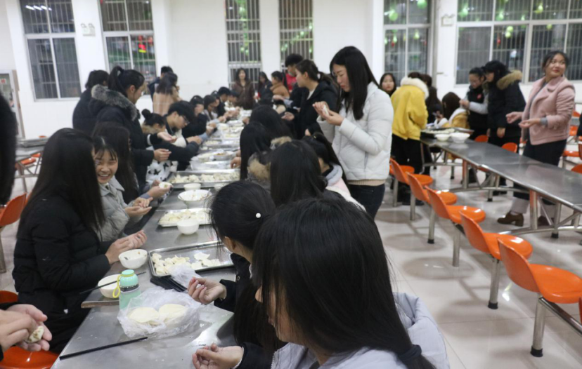 晚上的一食堂灯火通明,笑语盈盈。60余名学生分成六组围坐一起,共同为饺子事业奋斗着。女生自然是主力军,只见她们熟练地放馅料、蘸水、捏饺子,十指翻飞间,一只只精致的饺子就诞生了。不会包的学生也现场拜师学艺并成功出师,最后在大家的辛苦努力下,完成了近千只或胖或瘦、或扁或圆、形式各样的饺子。看着自己的劳动成果,同学们的成就感油然而生,纷纷感慨真像过年在家包饺子一样,热闹而有趣。