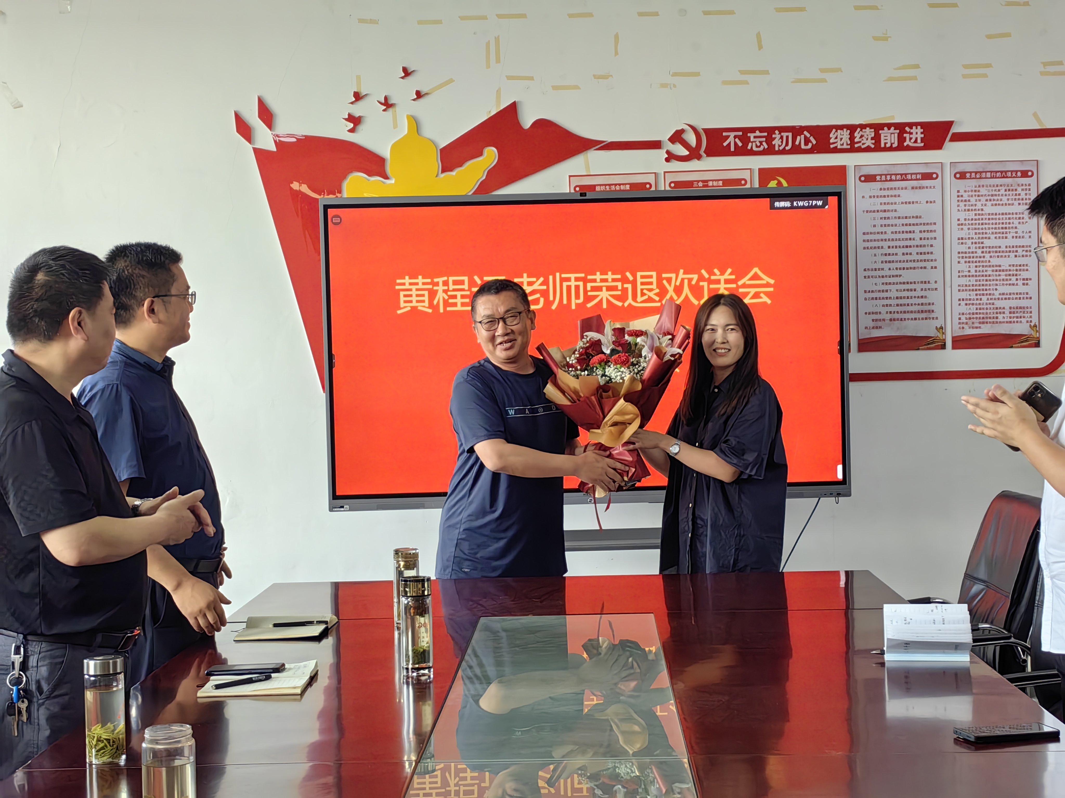 刘修树介绍了黄程远老师的基本情况。闫小满老师给荣退教师送上了鲜花,表达了全体教师对他的深深敬意。刘修树高度肯定了黄程远老师勤恳敬业的工作态度,把美好的青春年华奉献给了教育事业,为学生的成人成才,为学院的发展都做出了贡献。