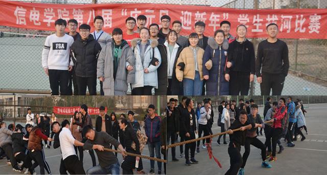 为培养大学生团队协作能力,发扬顽强拼搏精神,2017年12月26日下午,信电学院在校西篮球场举行第八届“庆元旦迎新年”学生拔河比赛。