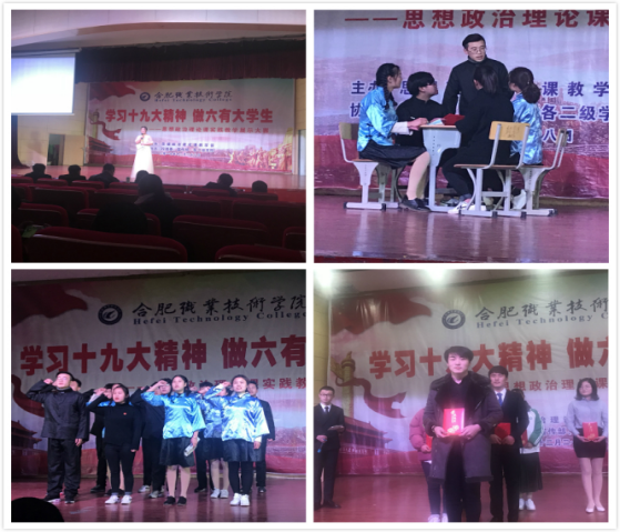 12月29日下午,由校马克思主义学院思想政治理论教学部主办,校宣传部、校团委及各二级学院协办的“学十九大精神、做六有大学生”实践教学展示大赛在校大学生活动中心拉开帷幕。各二级学院共选送12个节目参赛,节目形式为朗诵、演讲及舞台剧等,充分展示了我校青年学生认真学习“十九大”精神,争做“有理想、有追求、有担当、有作为、有品质、有修养”的六有大学生。