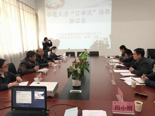会上,周晓隆副校长对中铁四局健康养老投资有限公司一行的来访表示热烈欢迎,并简要介绍了学校发展概况及校企合作情况。中铁四局健康养老投资有限公司副总经理孙君毅介绍了公司的概况、发展的理念、模式和前景,并对人才需求情况作了详细介绍。该公司充分肯定了我校在人才培养方面的成绩与办学特色,并表示希望通过建立订单培养的模式共同培育人才。