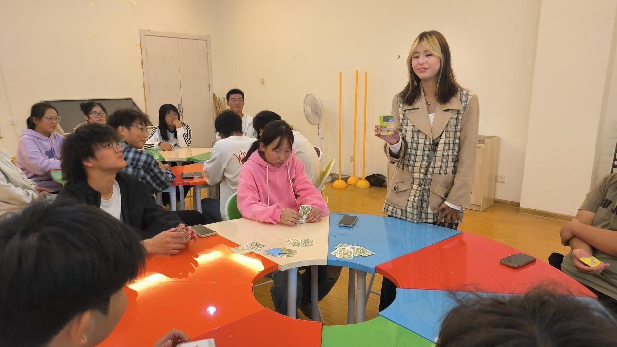 活动开始,李老师带领同学们进行了简单的热身活动,随后详细介绍了OH卡牌的心理学原理、使用方法及规则。在了解了OH卡牌的基本信息后,同学们满怀好奇与期待地开始了卡牌体验。通过抽取卡牌,同学们以过去、现在、未来的时间线进行了自我介绍,这种新颖的自我介绍方式不仅拉近了同学们之间的距离,还激发了大家参与活动的热情。