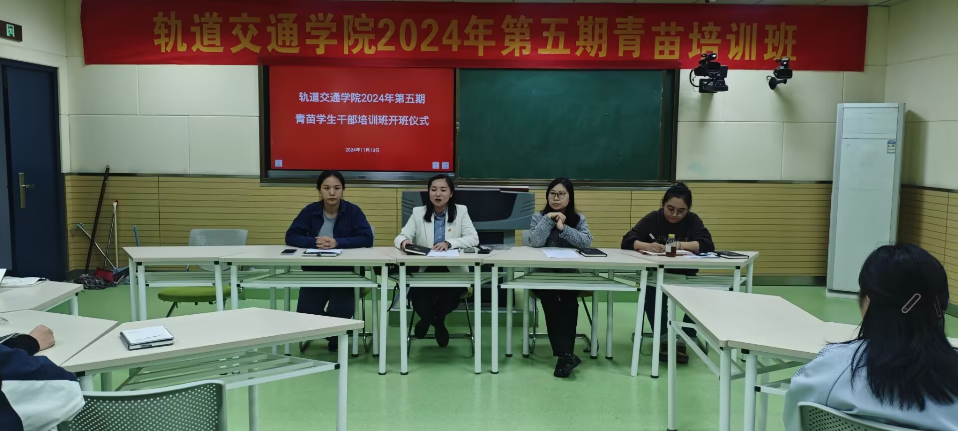 为充分发挥学生干部在大学生思想政治教育中的桥梁和纽带作用,加强学生干部的岗位意识、责任感和团队协作能力,进一步推动学院学风建设和学生组织队伍建设,1月13日,轨道交通学院团总支在教学北楼501教室举行青苗学生干部培训班开班仪式。轨道交通学院党总支副书记梁雯婷、专职组织员孙月、辅导员代表程沅君及该院全体学生干部共同参加开班仪式,仪式由该院团总支书记吴明丽主持。