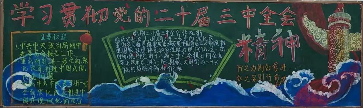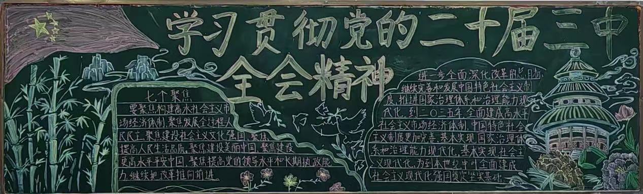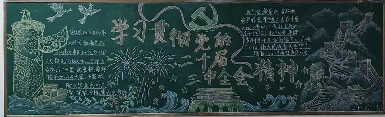 为深入学习宣传贯彻党的二十届三中全会精神,充分发挥好“黑板报”传统宣传阵地作用,引导广大青年学生深刻领会本次全会精神实质和丰富内涵,积蓄新征程的奋进力量,生物工程学院于11月底组织24级班级开展“学习党的二十届三中全会精神,勇担时代使命”主题黑板报活动。