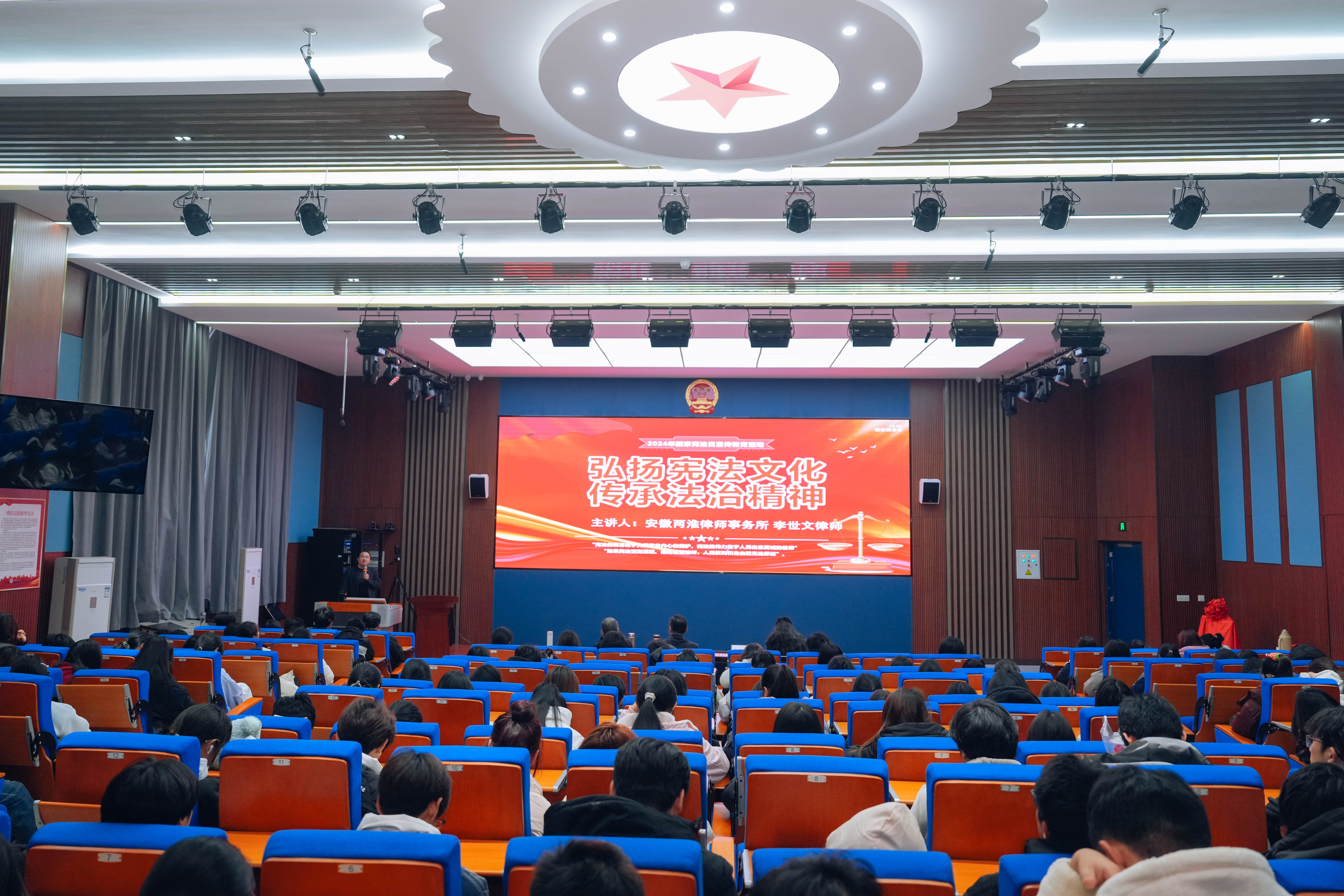 为深入学习贯彻习近平新时代中国特色社会主义思想、党的二十届三中全会精神和习近平总书记考察安徽重要讲话精神,在第十一个“国家宪法日”来临之际,为进一步引导我校学子弘扬宪法精神,维护宪法权威,促进形成尊崇宪法、遵守宪法、维护宪法的良好风尚,马克思主义学院组织师生开展系列法治宣传教育活动。12月4日国家宪法日当天,“法治教育实践基地”成立仪式暨“法治教育大讲堂”活动在汇心湖校区模拟法庭举行。安徽两淮律师事务所主任李世文、律师周云、马克思主义学院党支部书记王文飞、院长胡心红出席了活动。天平法学会和青年马克思主义学会160余名学生代表参加了此次活动。