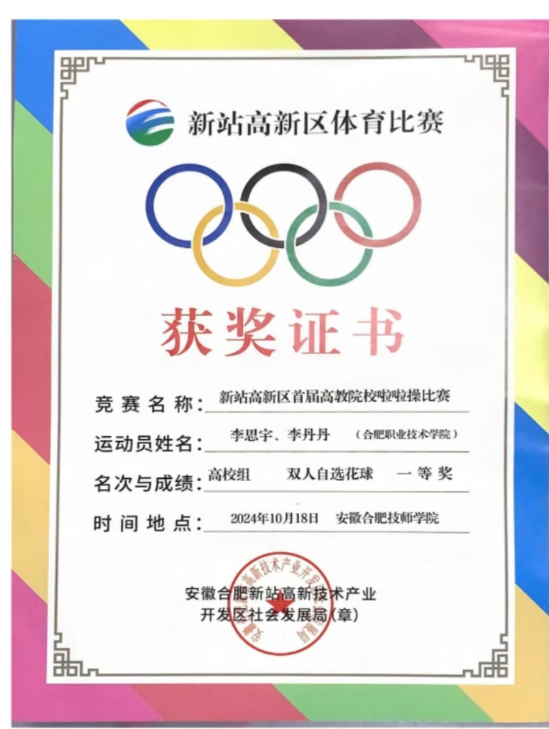在啦啦操双人自选花球项目中,我校刘靖文老师指导的李思宇和李丹丹两位同学,凭借默契的配合、精湛的技术和出色的表现力,成功夺得了一等奖的殊荣。这一成绩的取得,不仅展示了我校基础教育学院啦啦操队的实力和水平,也充分体现了两位选手在训练中的辛勤付出和不懈努力。比赛期间,基础教育学院副院长(主持行政工作)施敏发和教学办主任尹悦来到现场,为两位选手加油助威。他们的到来不仅为选手们增添了信心和动力,也进一步彰显了基础教育学院对体育工作的重视和支持。