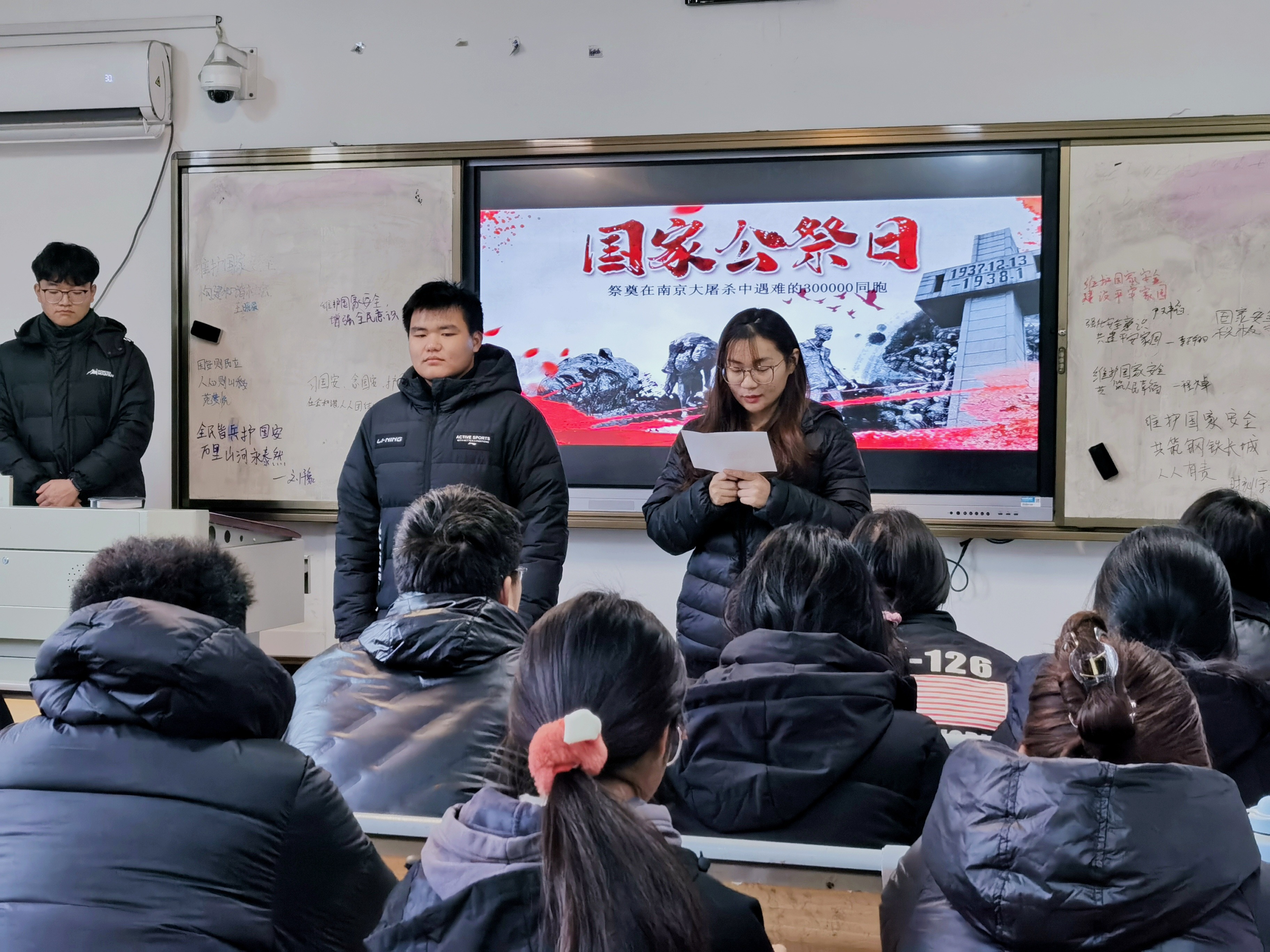礼铭国殇,警钟长鸣。上午10时,社团在教学南楼106和406两个教室同时开展国家公祭日默哀仪式。主持人介绍了国家公祭日的由来和南京大屠杀的历史记忆,在惕厉的防空警报声中,同学们庄严肃立,向南京大屠杀遇难同胞默哀三分钟。