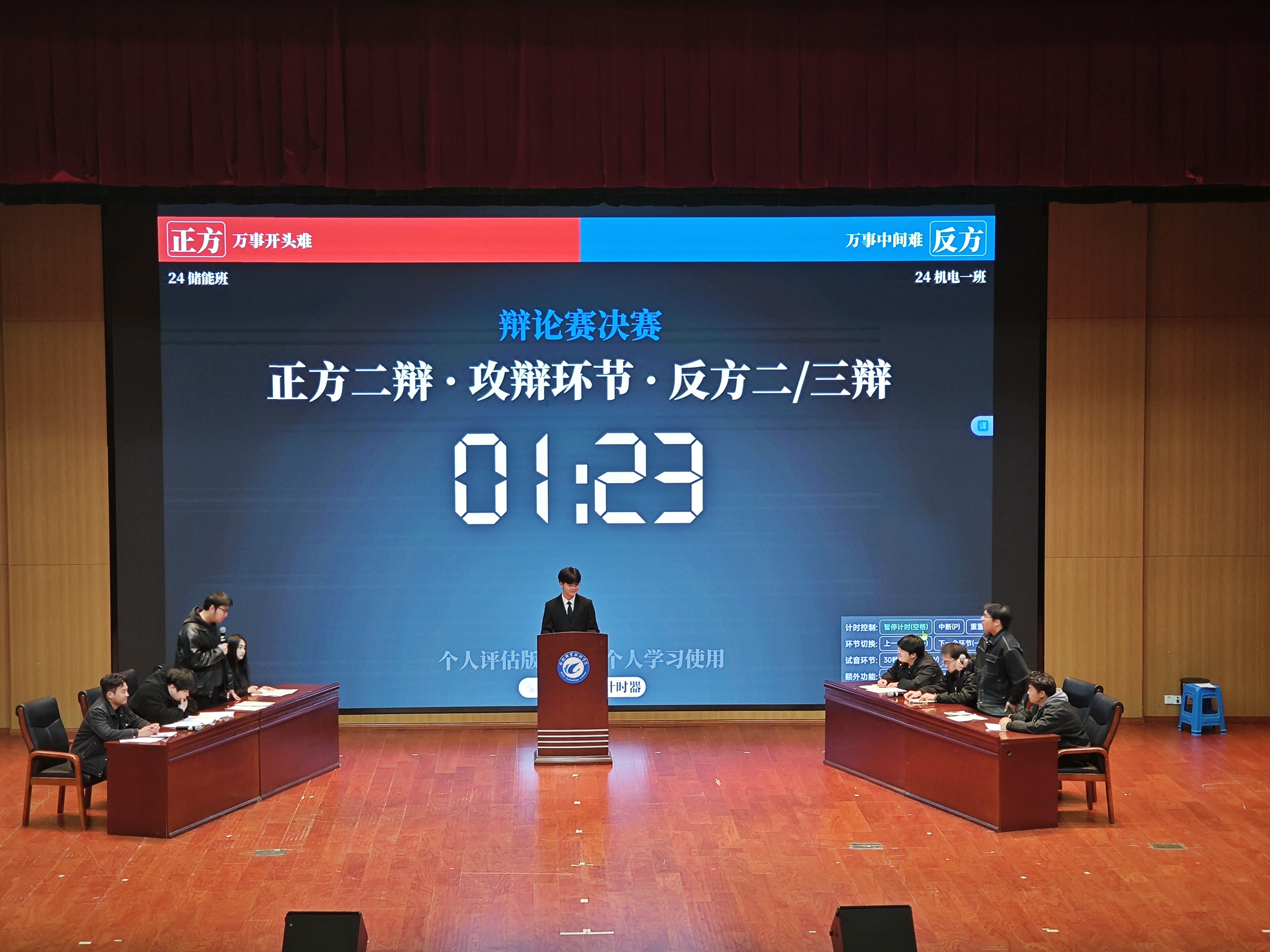 辩以明思,论以启智。为活跃校园文化氛围,提升学生们的思辨和语言表达能力,12月18日,机电工程学院新生辩论赛决赛在汇心湖校区大学生活动中心报告厅举行。经过前期的激烈角逐,四支队伍脱颖而出站在了决赛的舞台上。